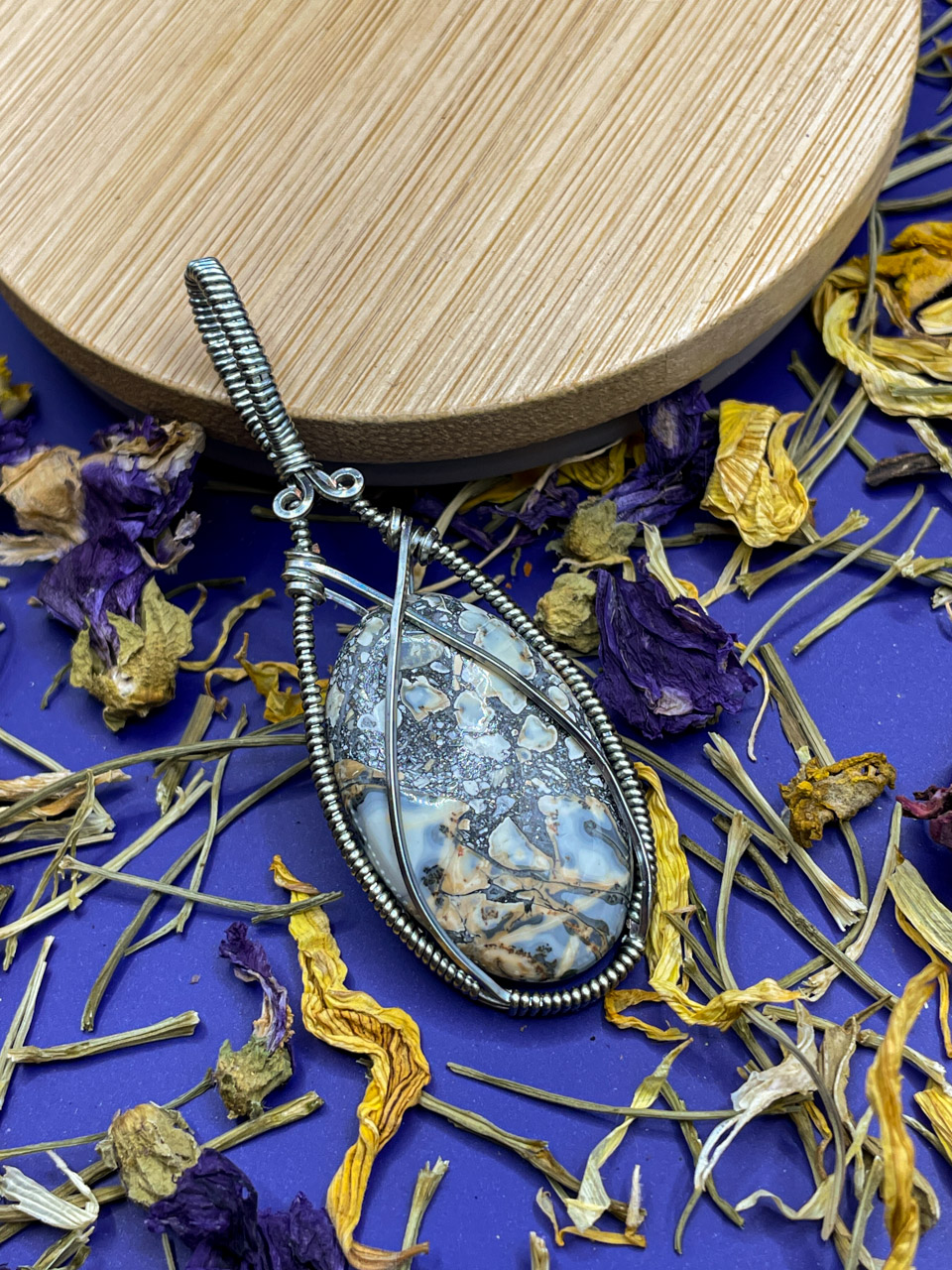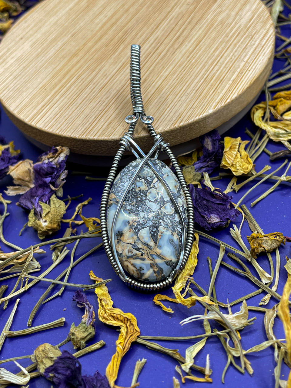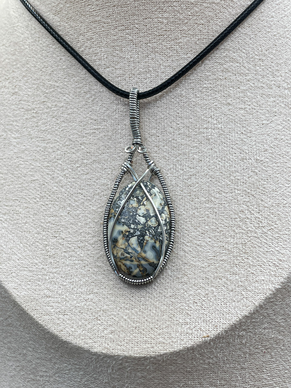 Velikost kamene, včetně drátku: 2,4x6,6x0,6 cm. Přívěsek bude na voskované černé šňůrce.
