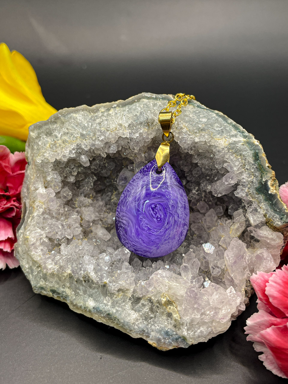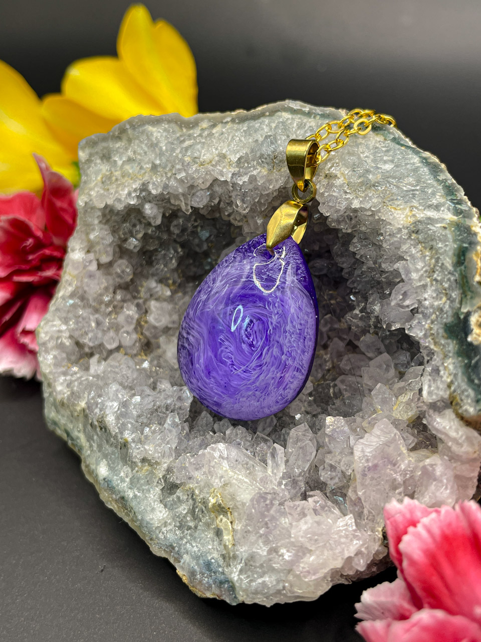 Fialový vír schovaný do pryskyřice. A teď se může houpat na tvém krku.