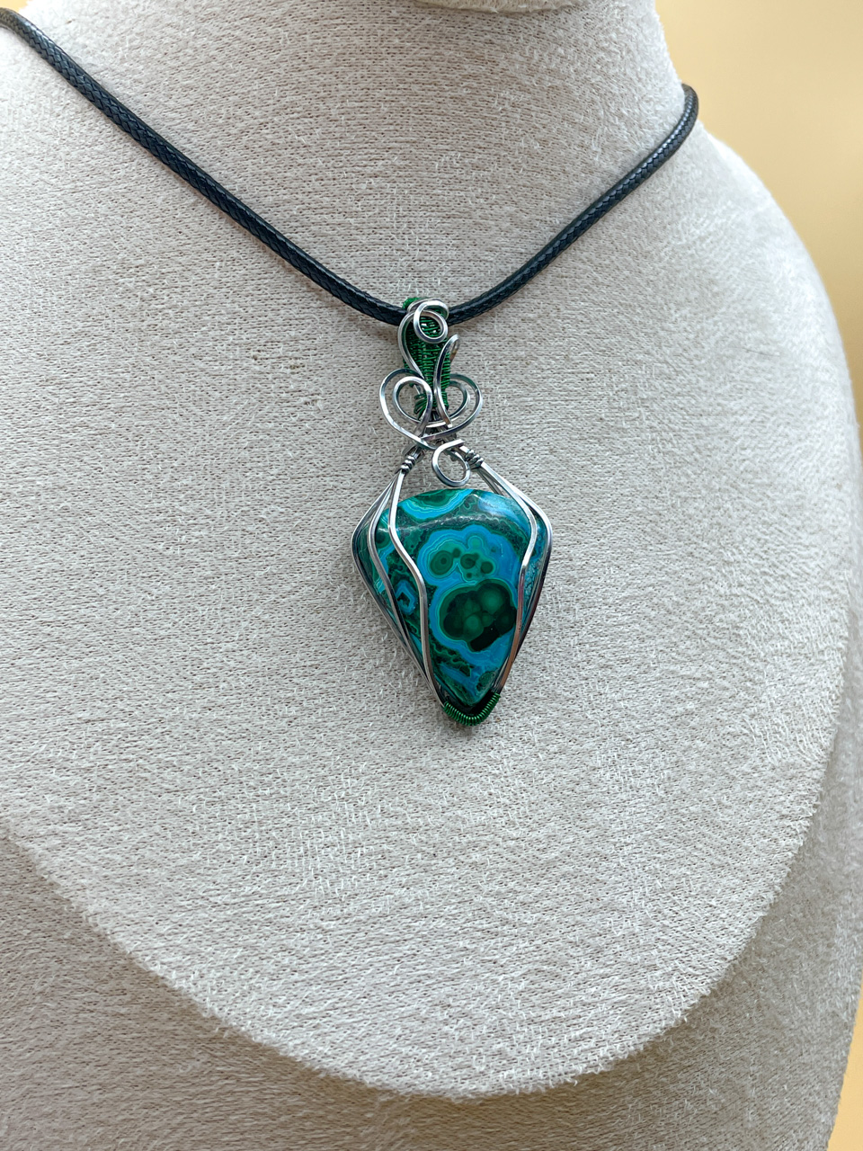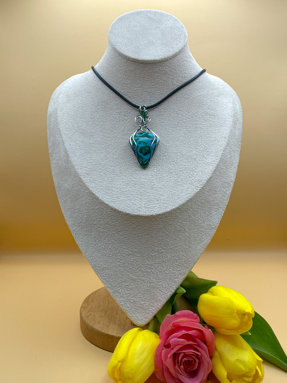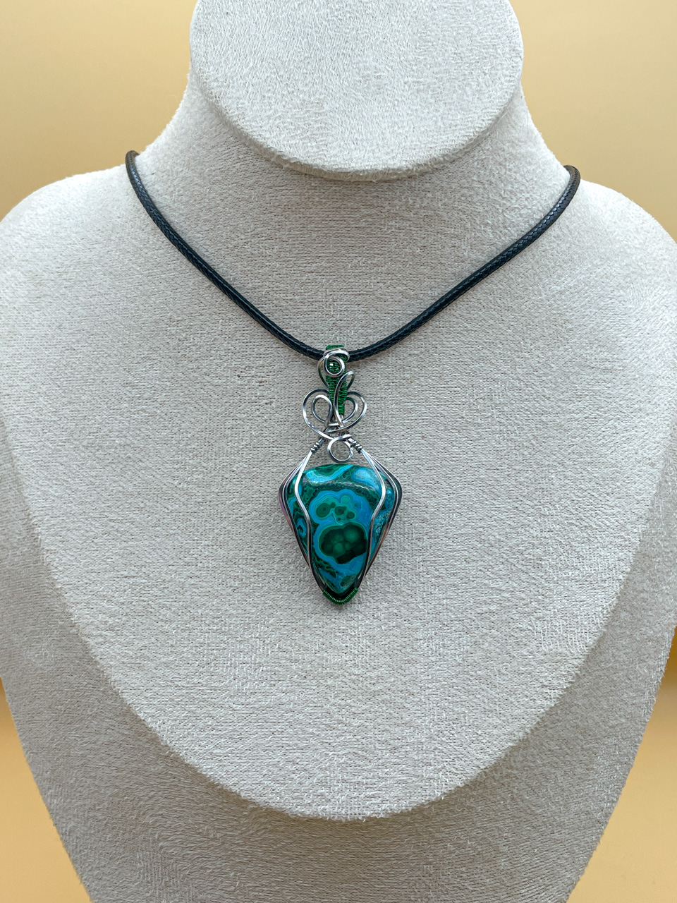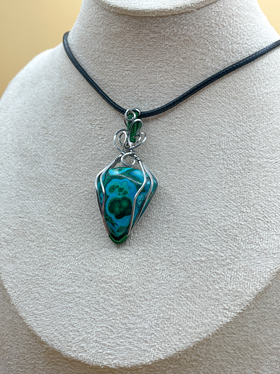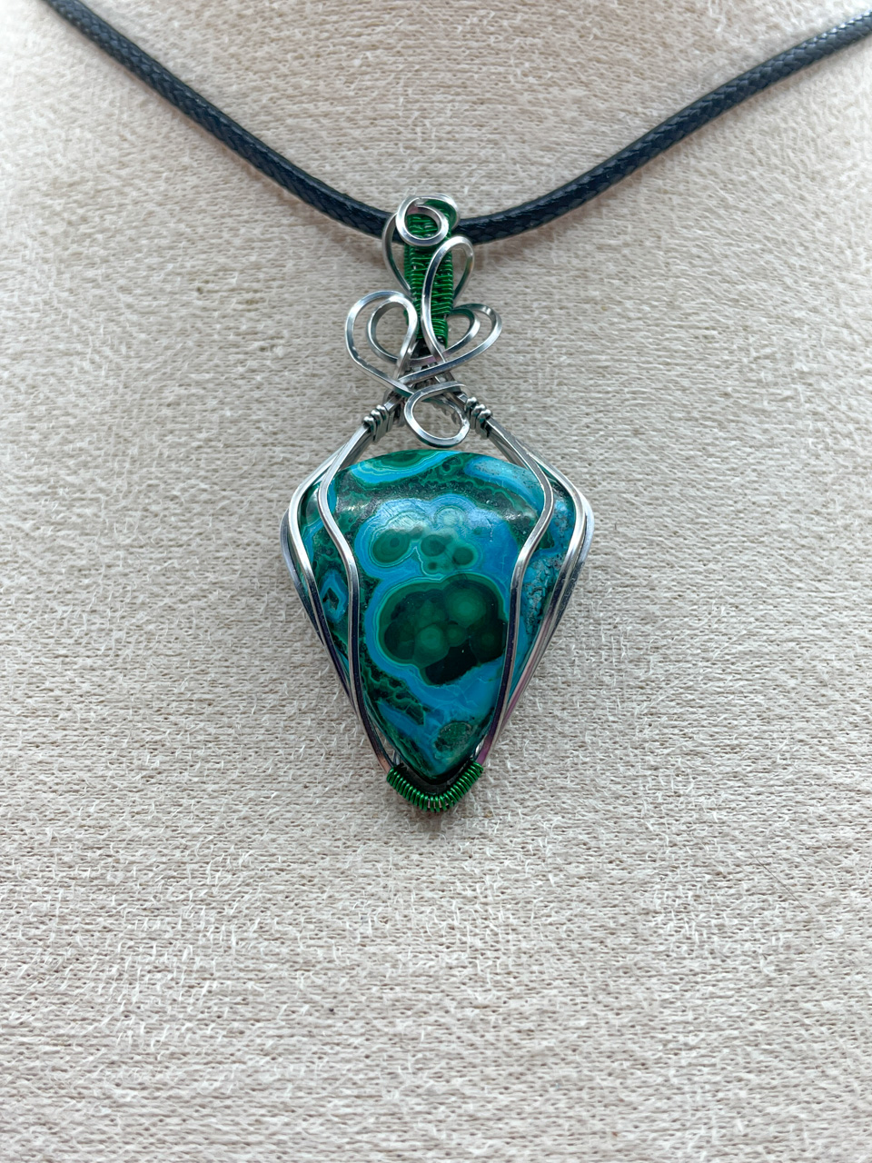 Velikost kamene včetně drátku: 2,7x5,7x0,9cm. Přívěsek bude na voskované černé šňůrce dlouhé 45cm.