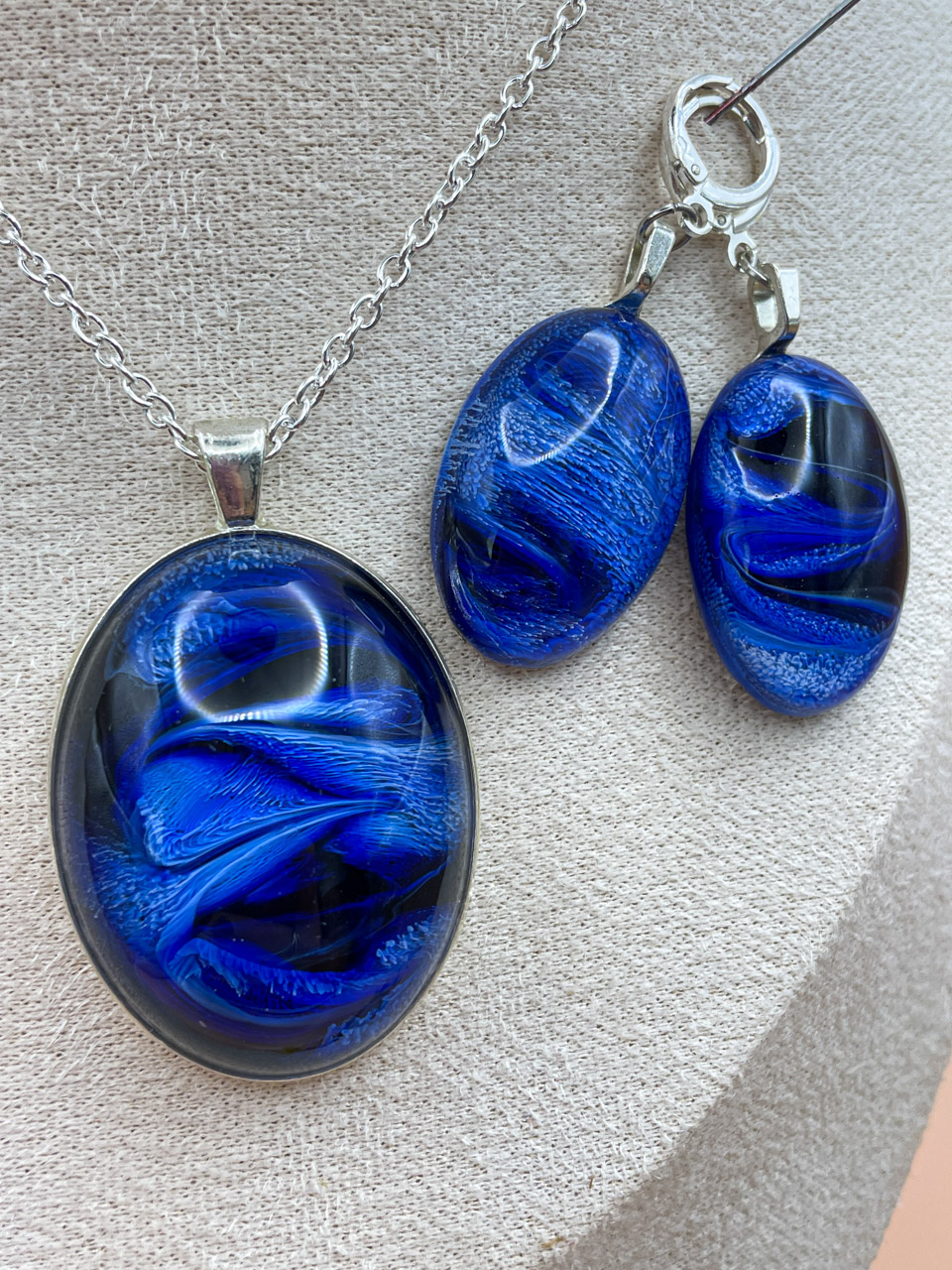 Délka řetízku: 51cm + 8cm prodlužovací řetízekVelikost přívěsku (včetně rámu): 5x3,2x1,3 cmVelikost náušnic (pouze kabošon): 3x2x1 cm