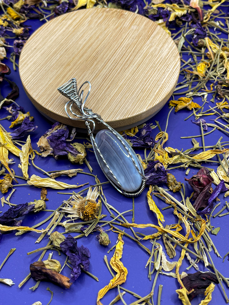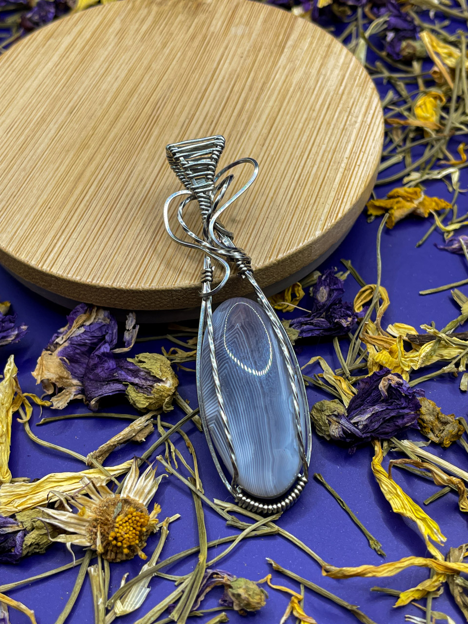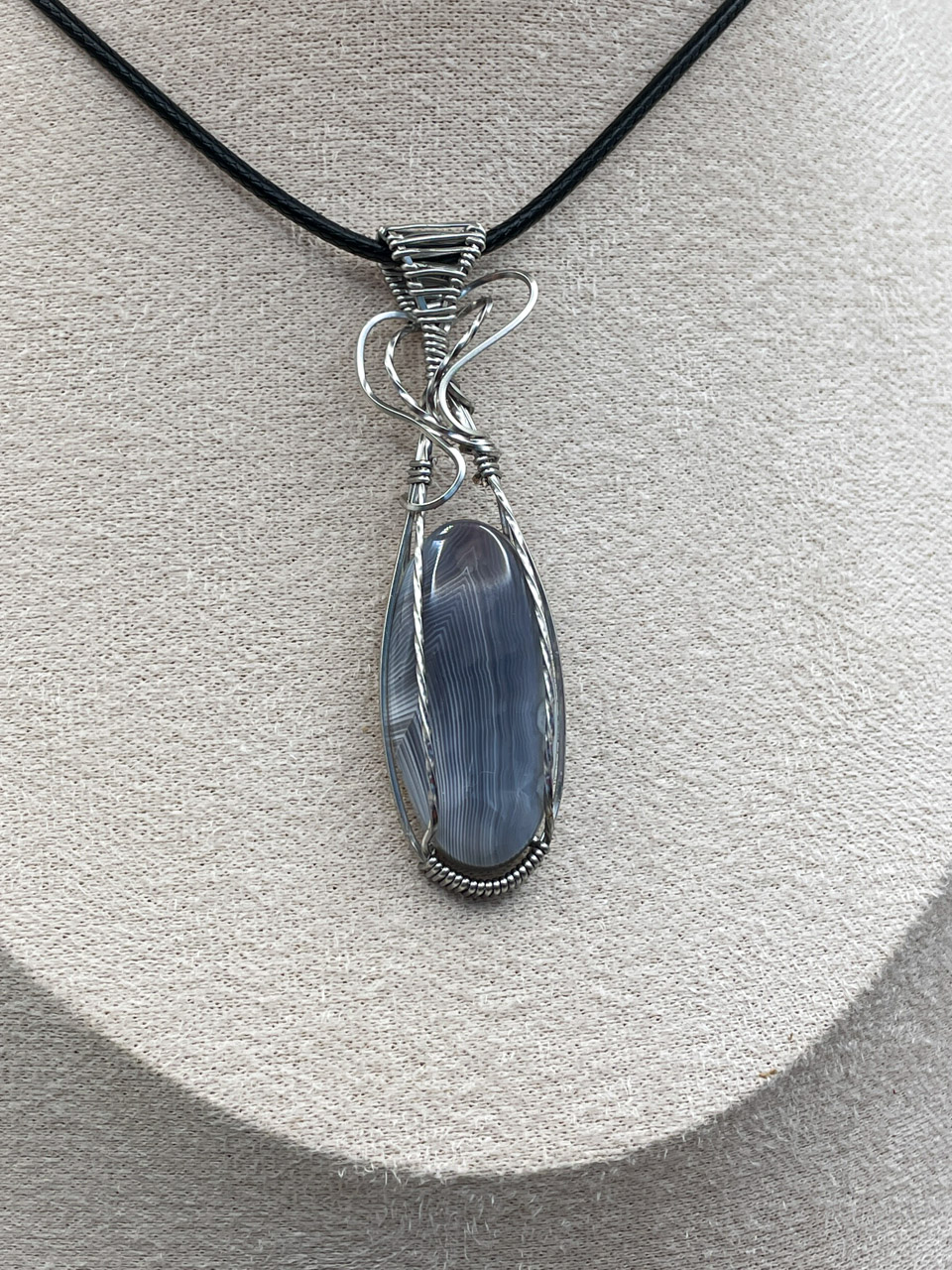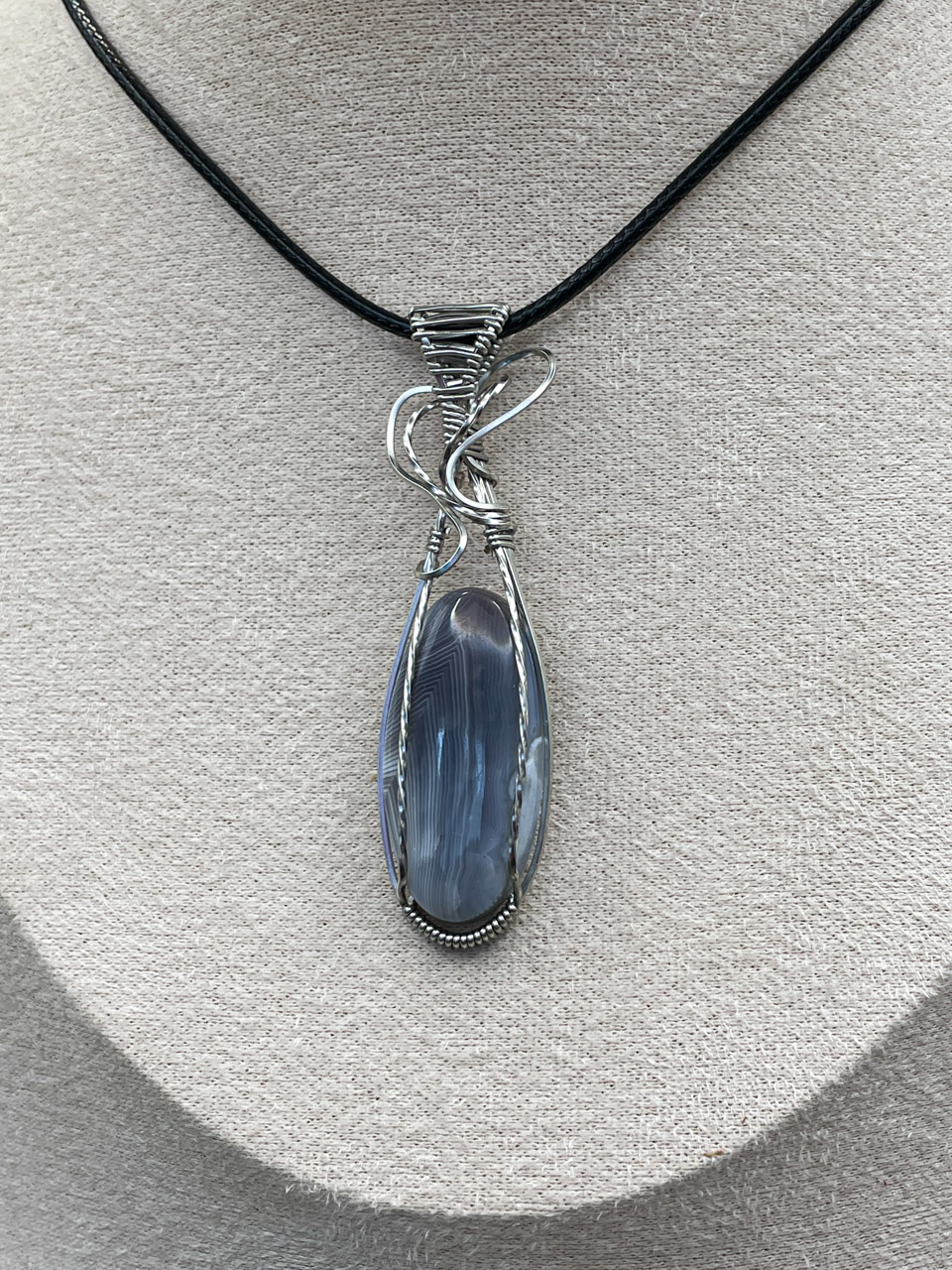 Velikost kamene, včetně drátku: 1,9x6,7x0,8 cm. Přívěsek bude na voskované černé šňůrce.