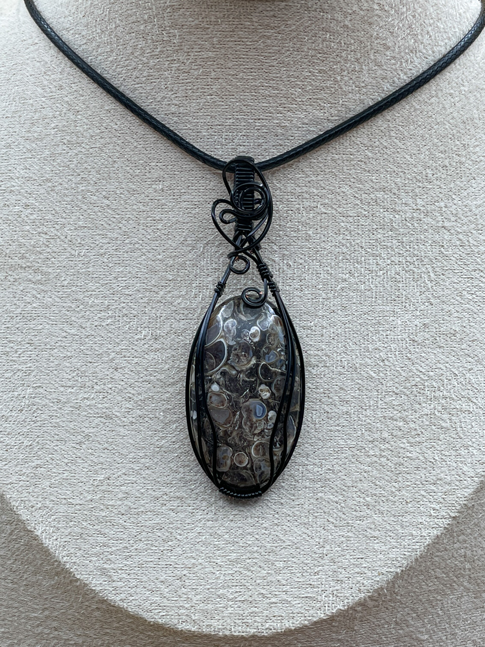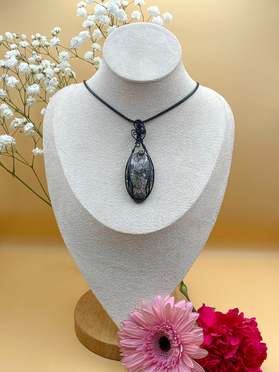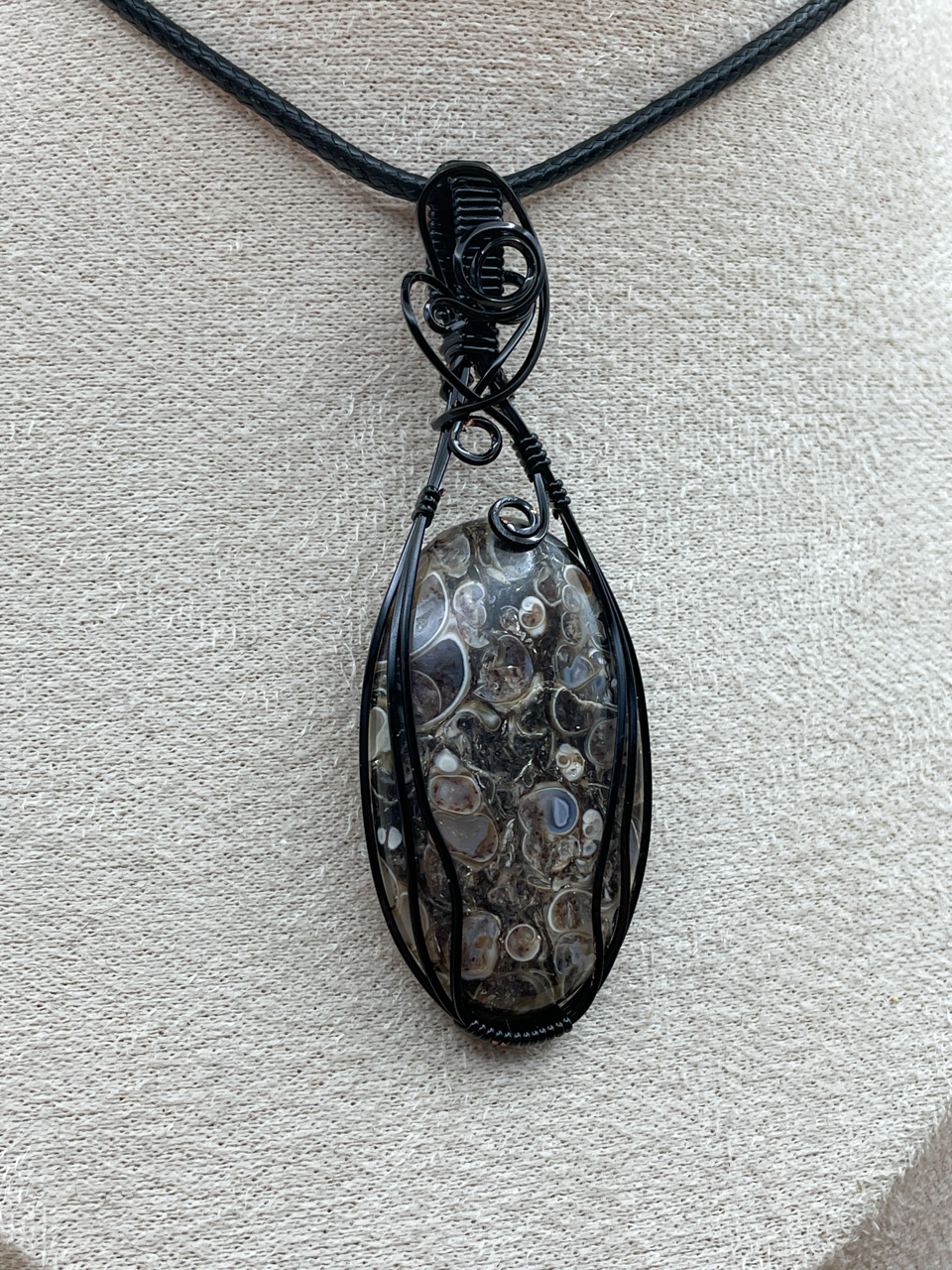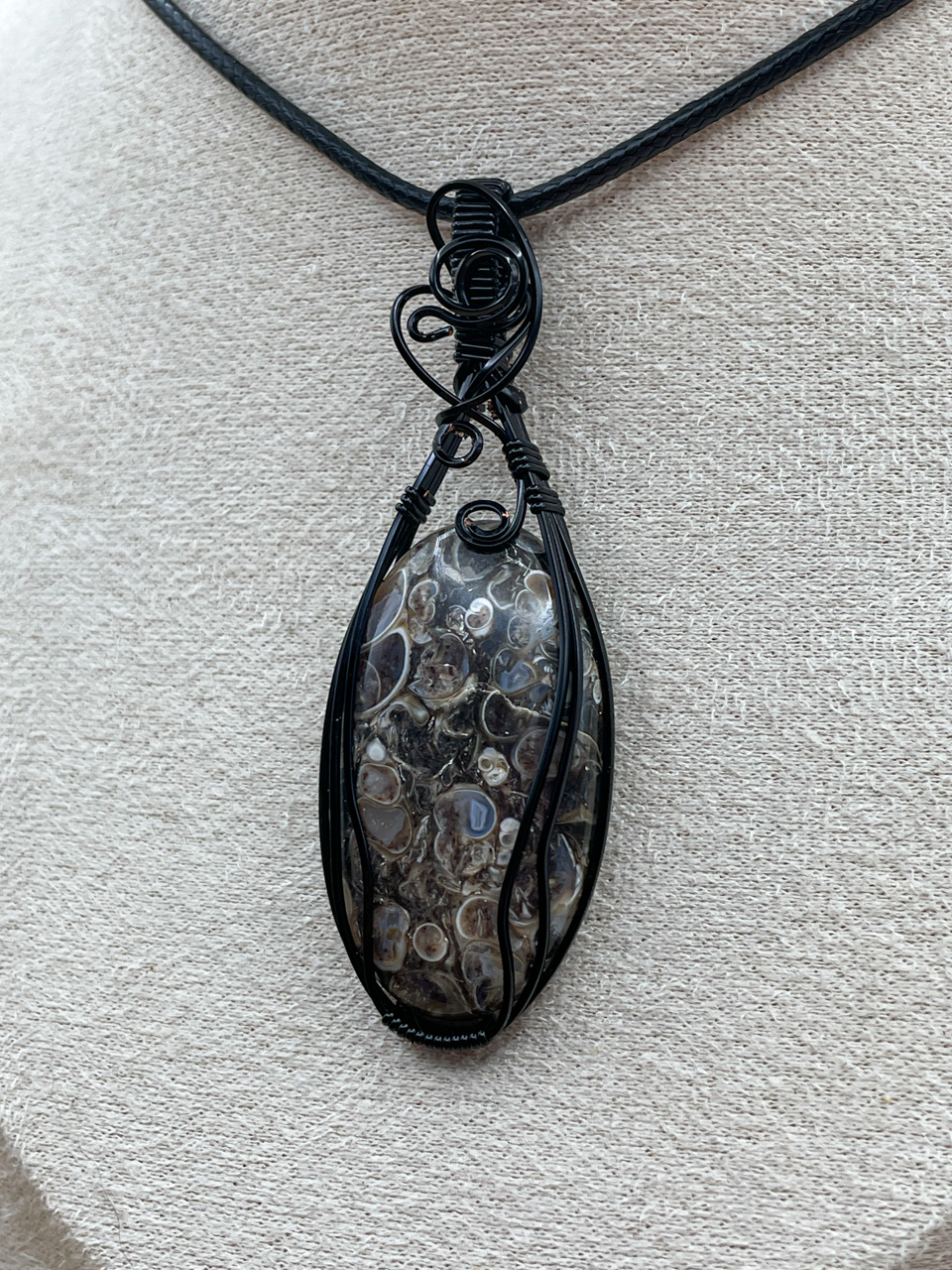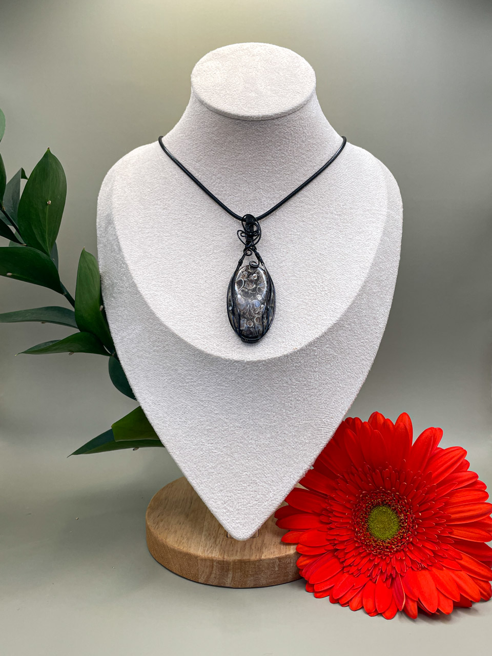 Velikost kamene včetně drátku: 2,6x7,4x0,6 cm. Přívěsek bude na voskované černé šňůrce.