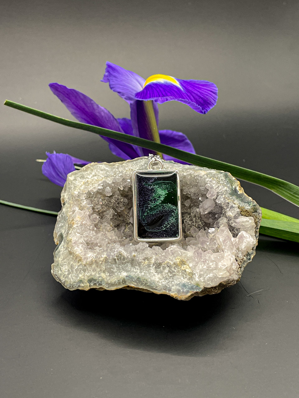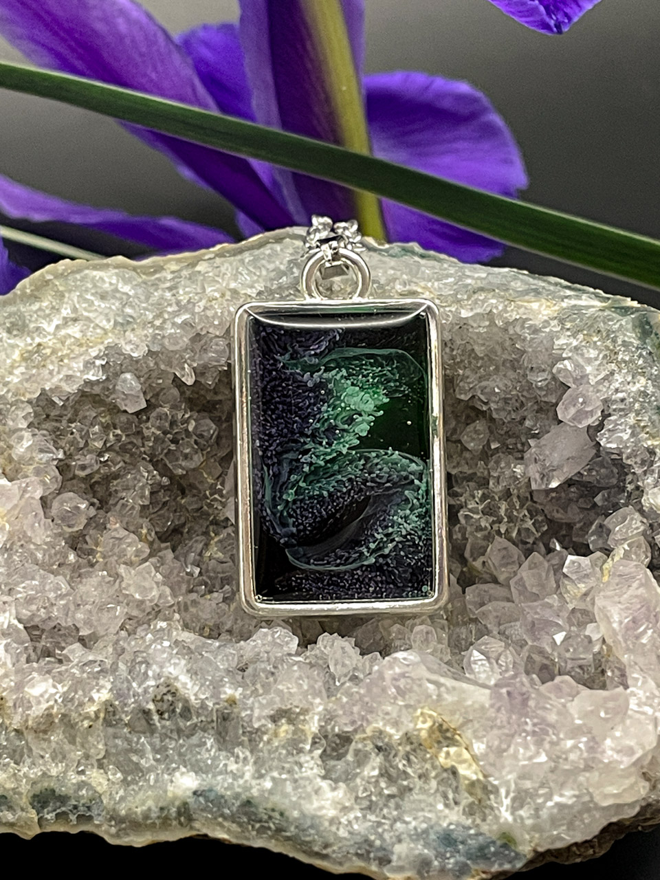 Pryskyřice ve stříbrném rámu. Řetízek je dlouhý 50cm + 7cm prodlužovací řetízek.
