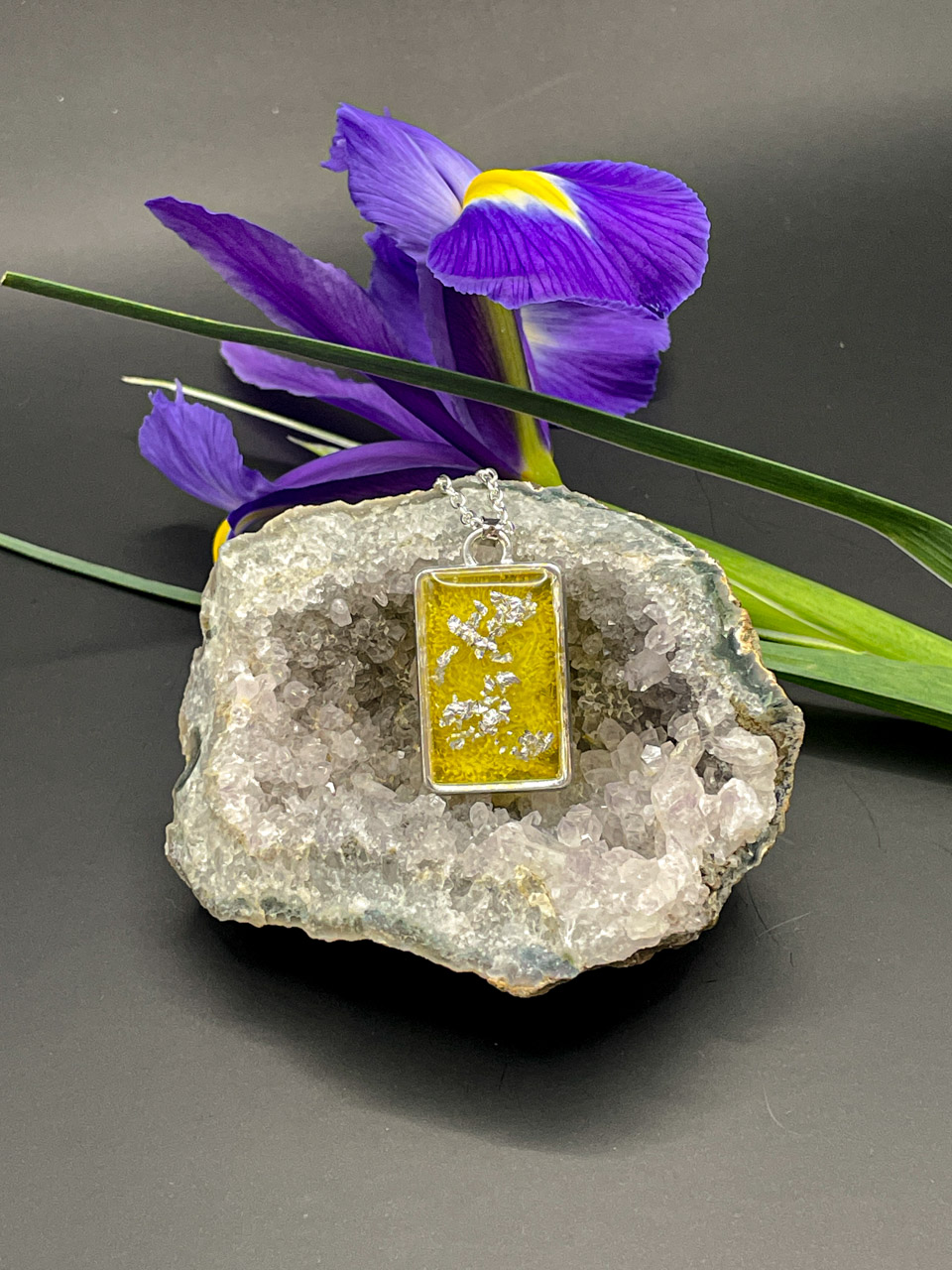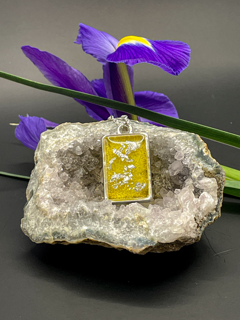 Pryskyřice ve stříbrném rámu. Řetízek je dlouhý 50cm + 7cm prodlužovací řetízek.