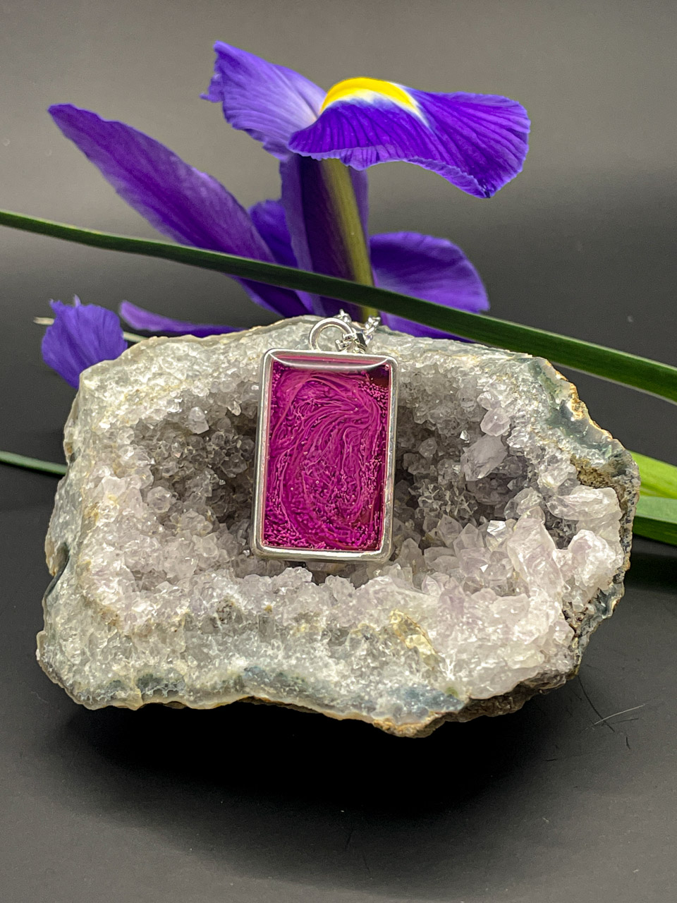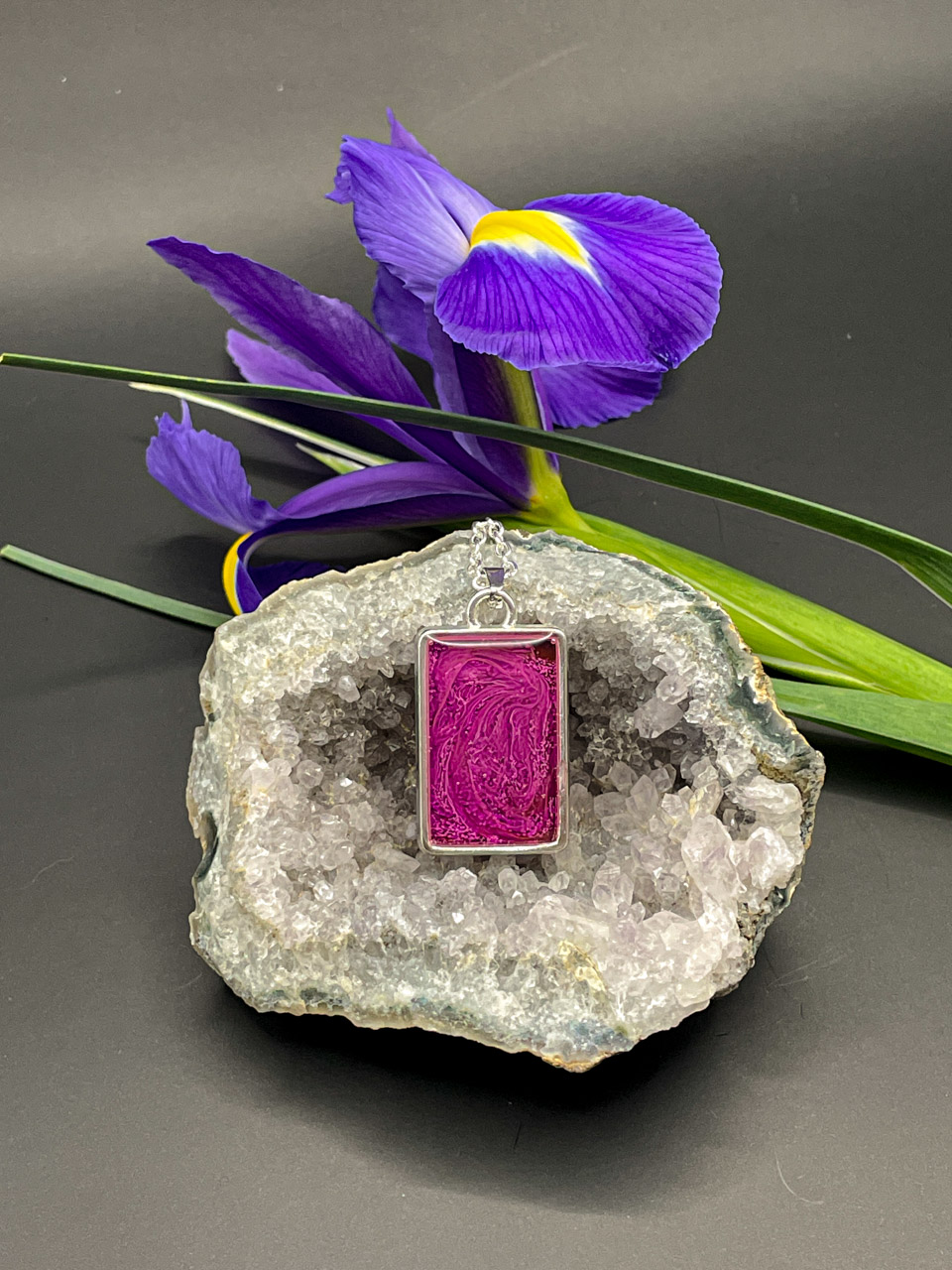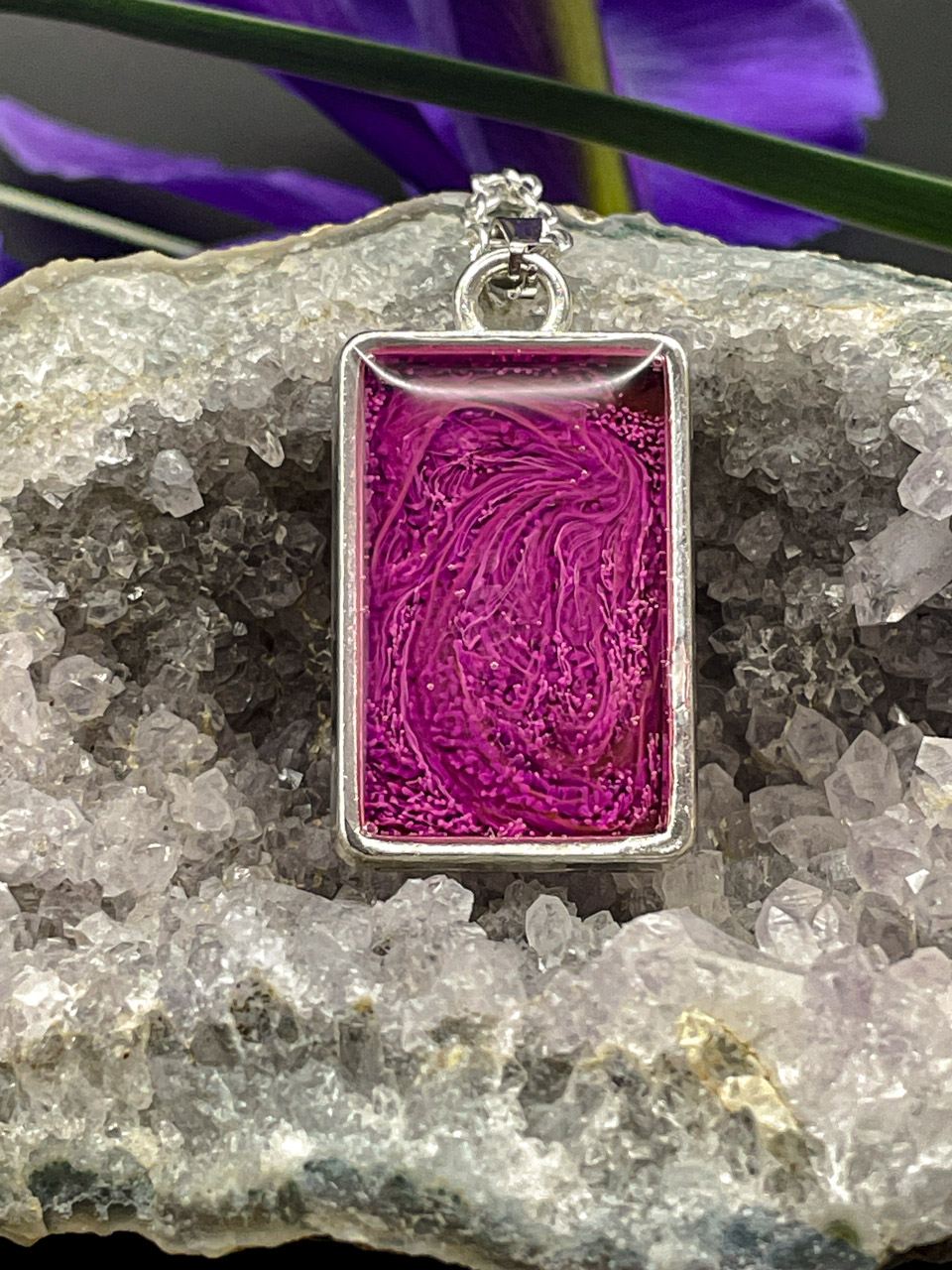 Pryskyřice ve stříbrném rámu. Řetízek je dlouhý 50cm + 7cm prodlužovací řetízek.