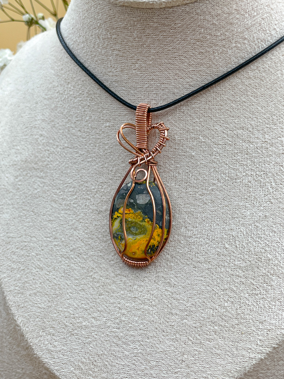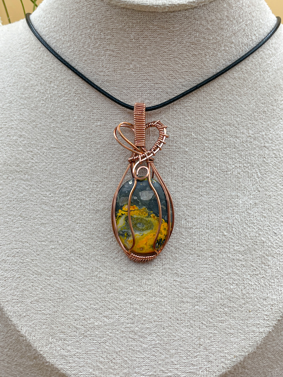 Velikost kamene včetně drátku: 2,4x5,7x0,7 cm. Přívěsek bude na voskované černé šňůrce.