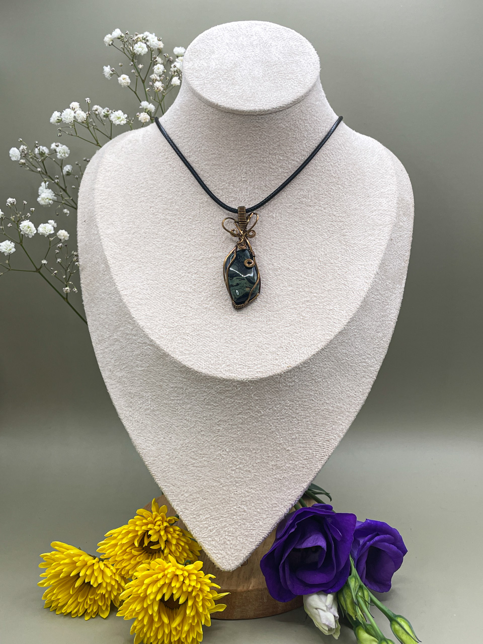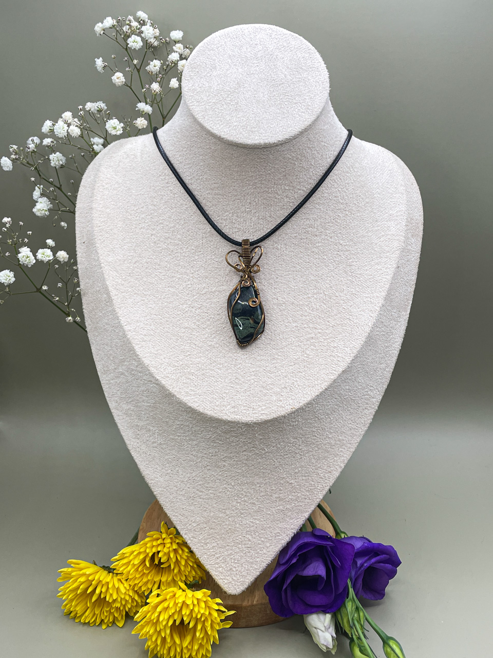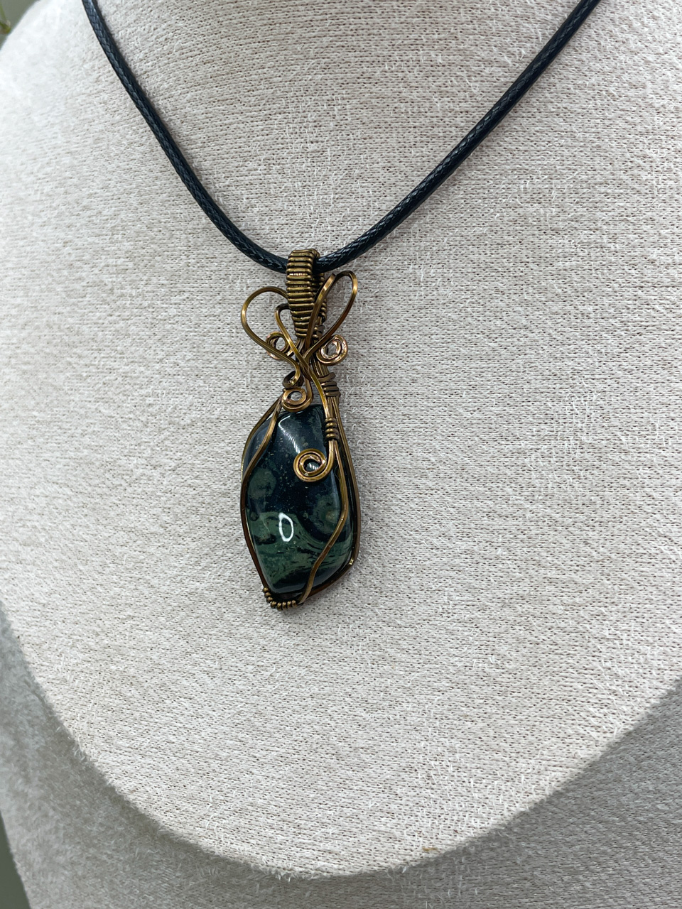 Velikost kamene, včetně drátku: 1,9x5,7x0,8 cm. Přívěsek bude na voskované černé šňůrce.