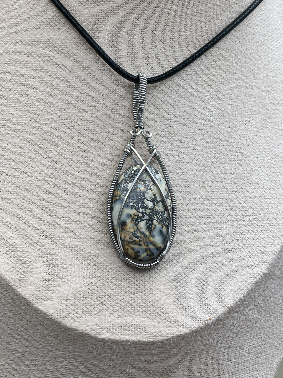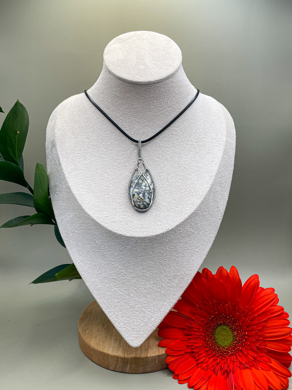 Velikost kamene, včetně drátku: 2,4x6,6x0,6 cm. Přívěsek bude na voskované černé šňůrce.