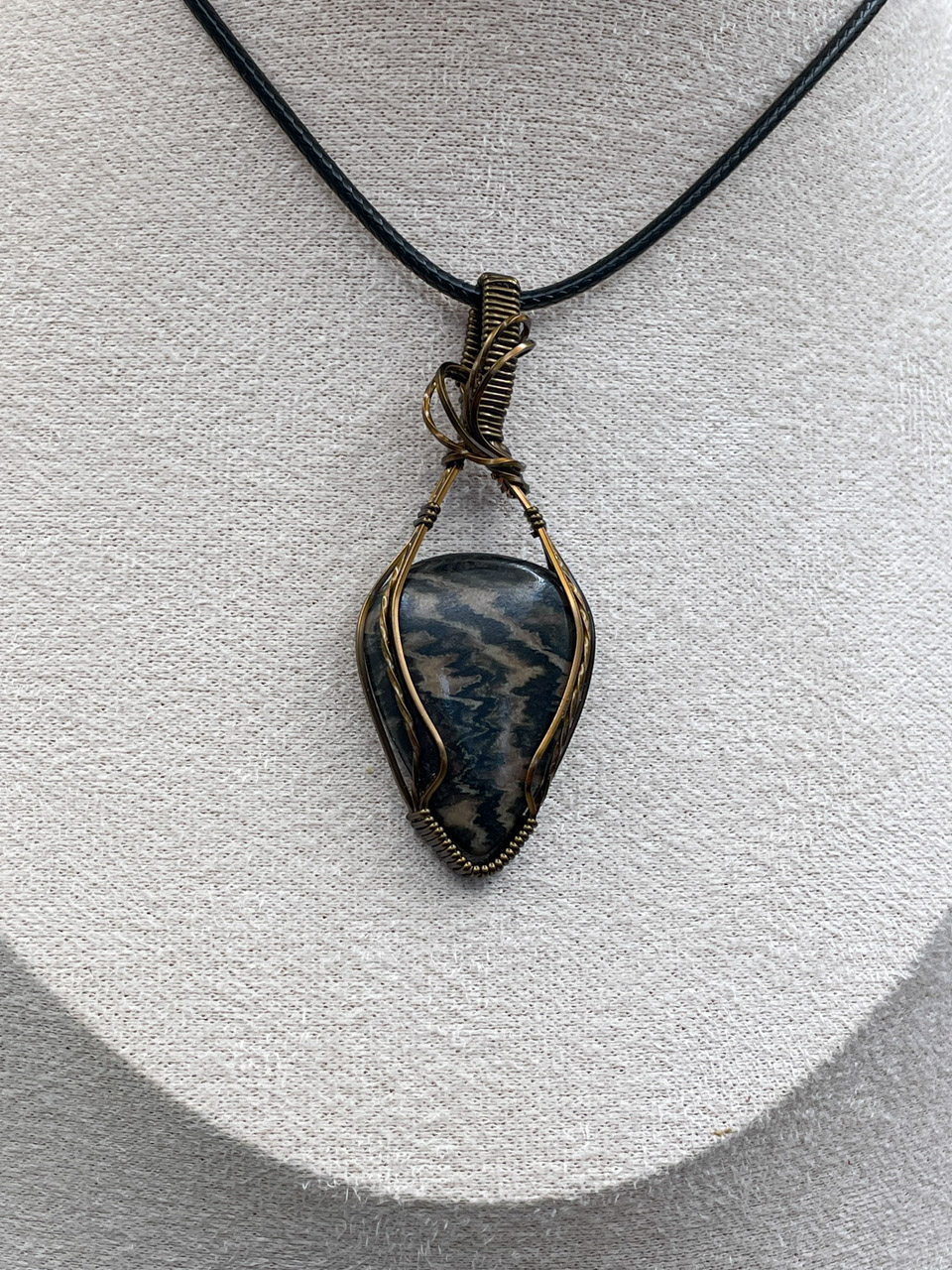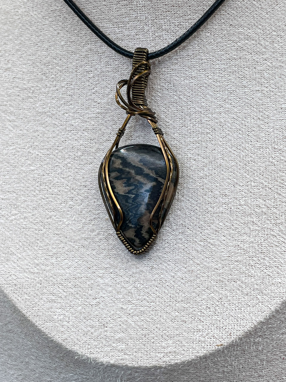 Velikost kamene včetně drátku: 2,6x6,5x1 cm. Přívěsek bude na voskované černé šňůrce.