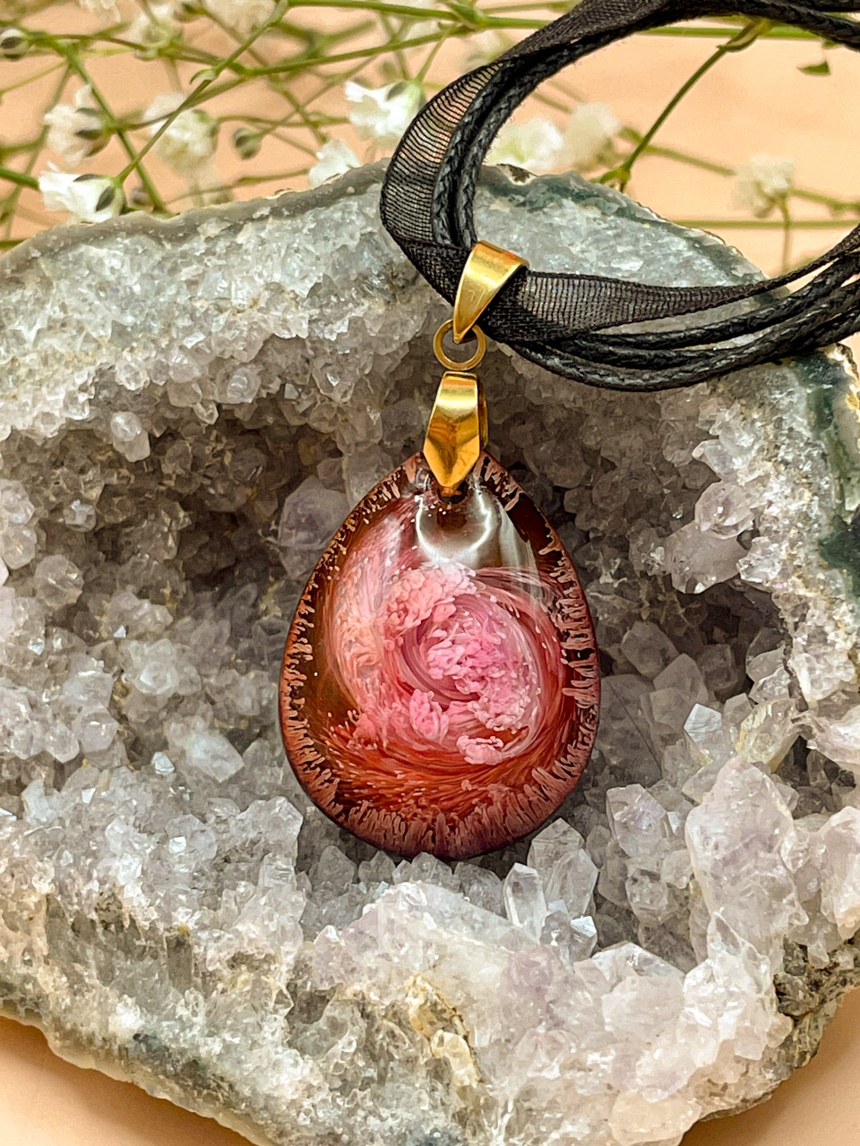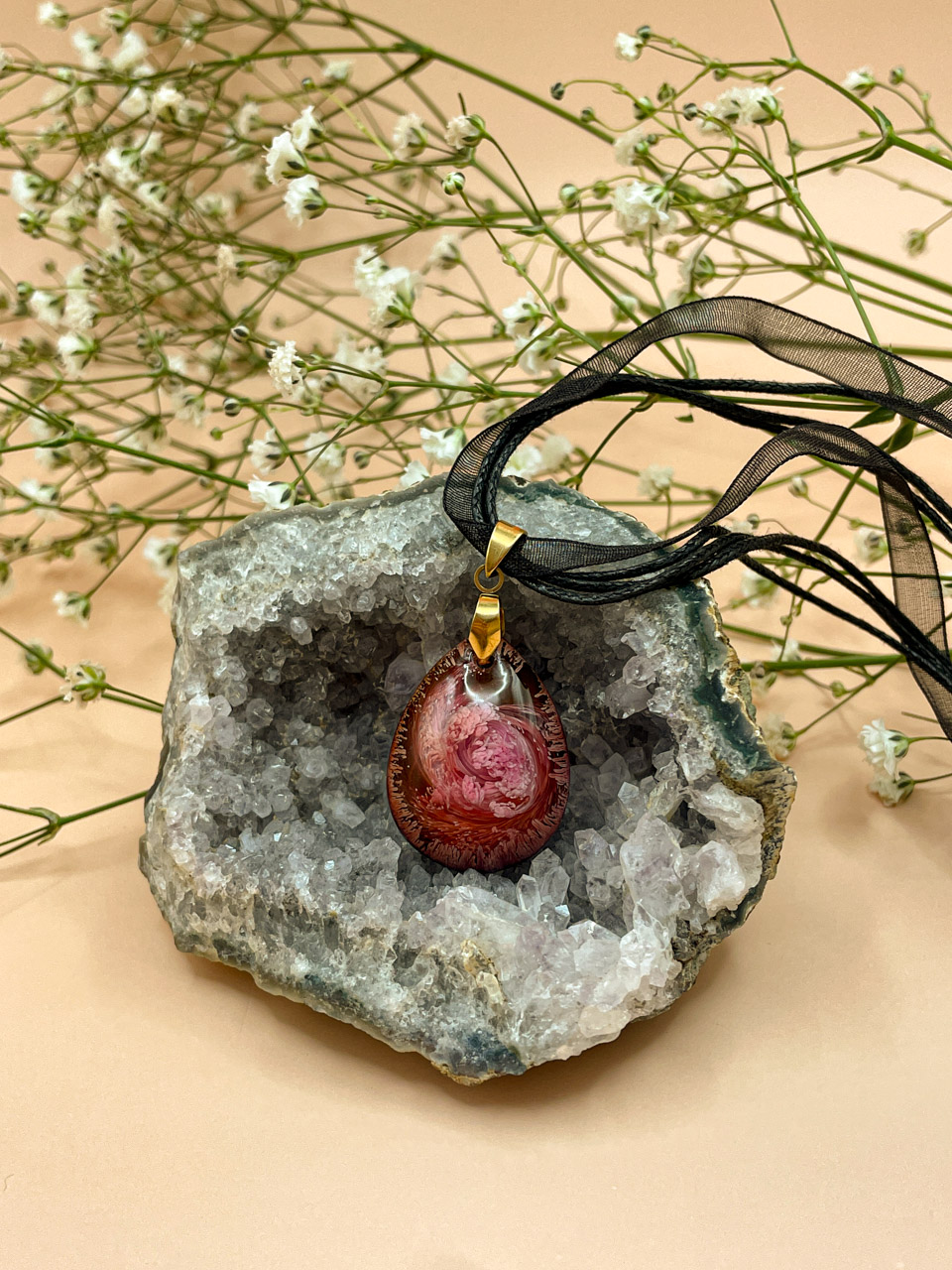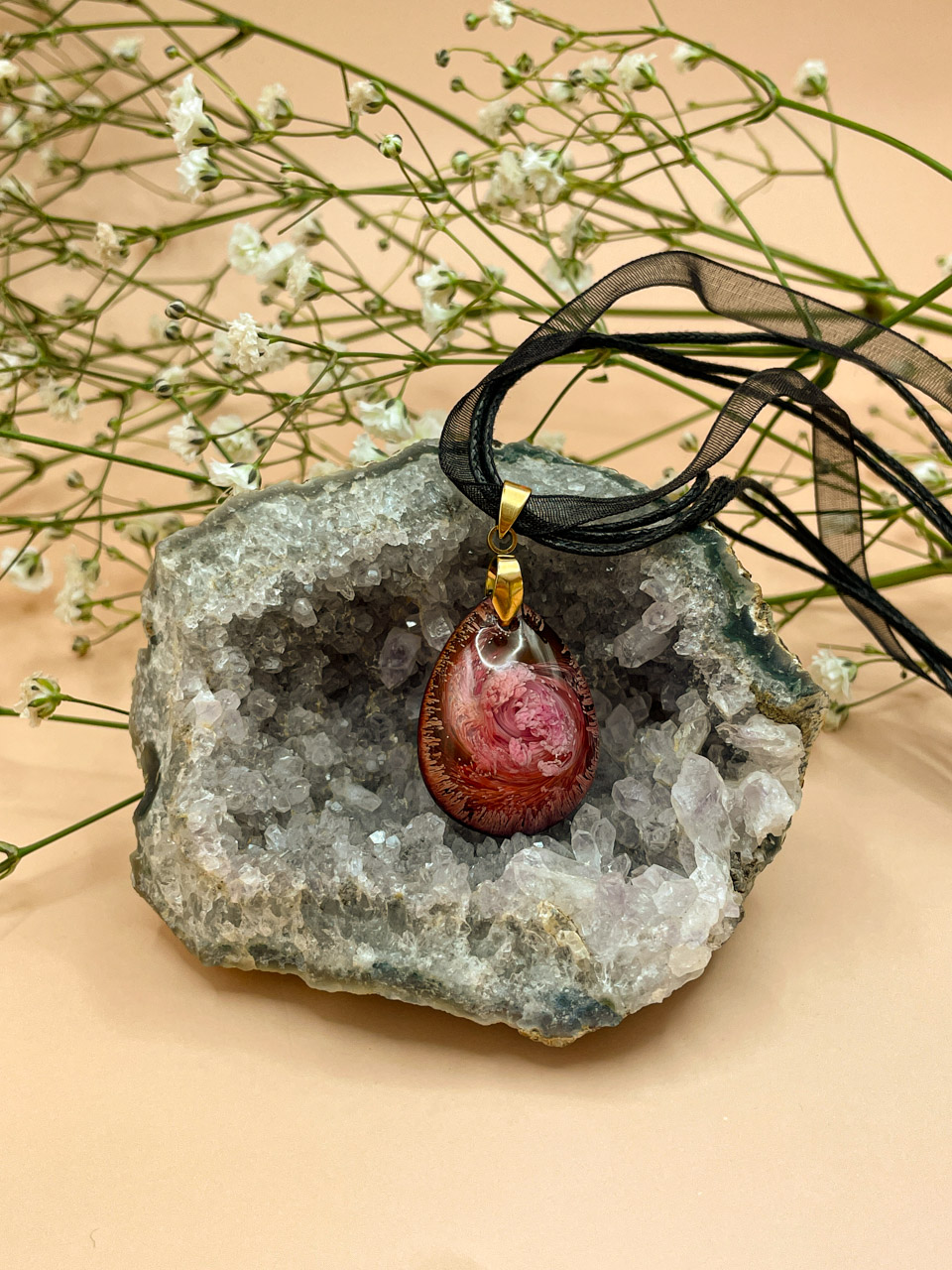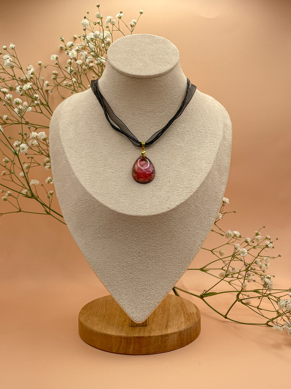 Náhrdelník s přívěskem z pryskyřice. Délka stuhy je 42cm + 5cm prodlužovací řetízek. Kapka je velká 3cm.