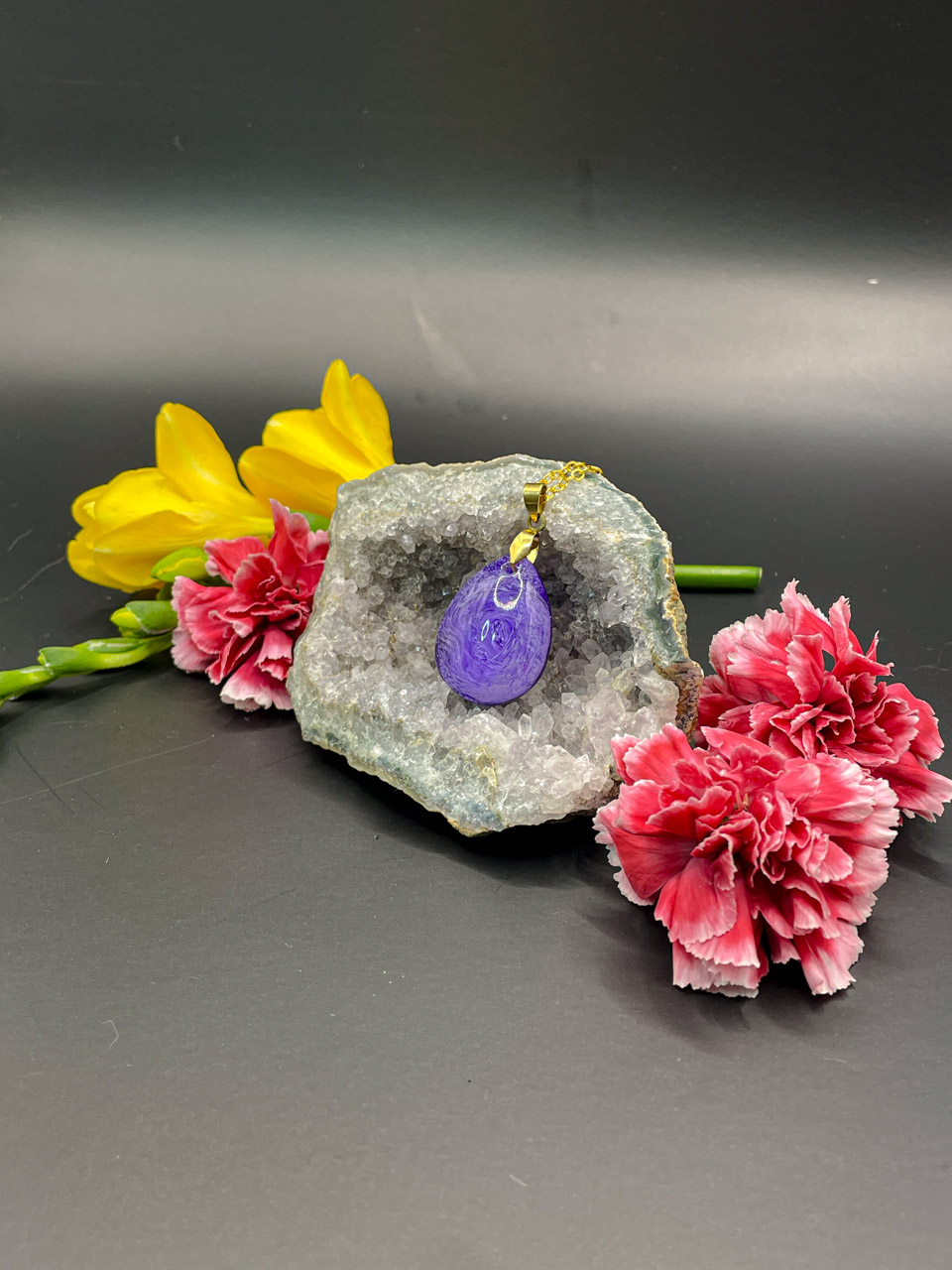 Fialový vír schovaný do pryskyřice. A teď se může houpat na tvém krku.