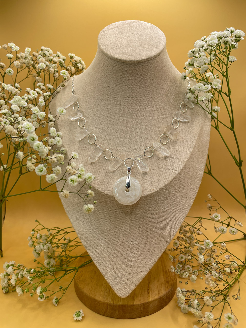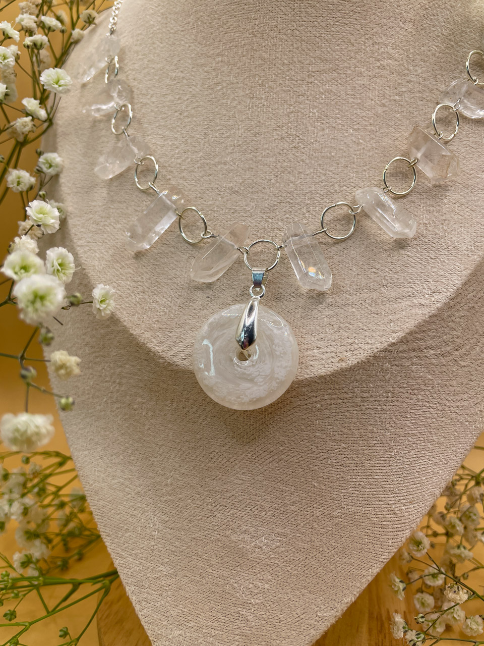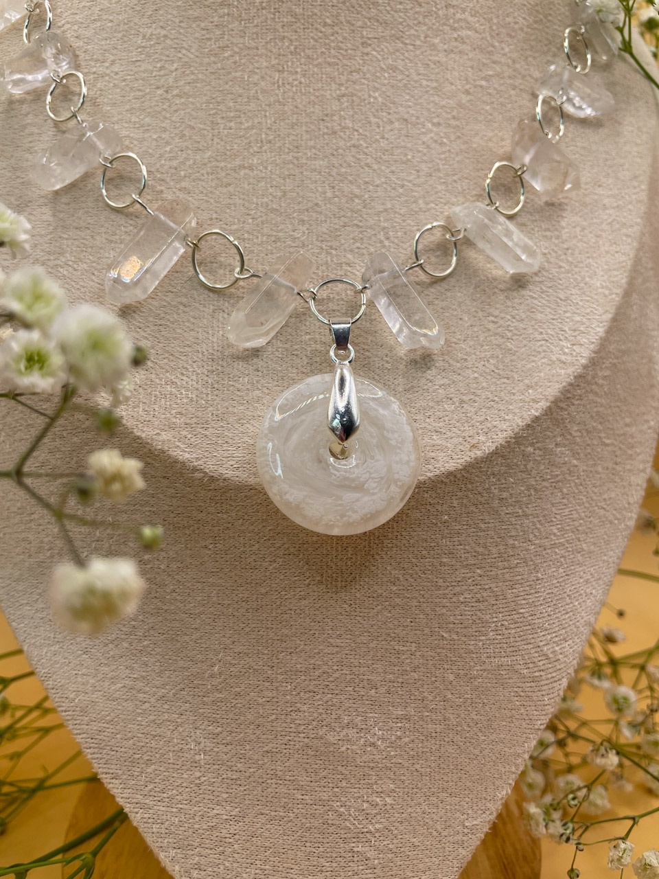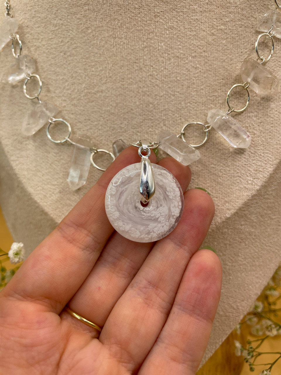 Náhrdelník s přívěskem z pryskyřice, doplněný o přírodní křišťál. Délka řetízku je 50cm+ 7cm prodlužovací řetízek. Donut je velký 2,5cm.