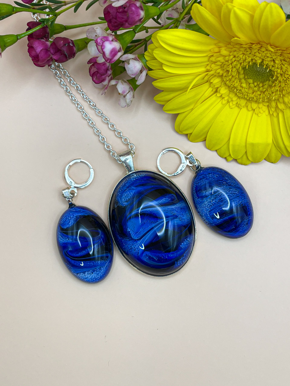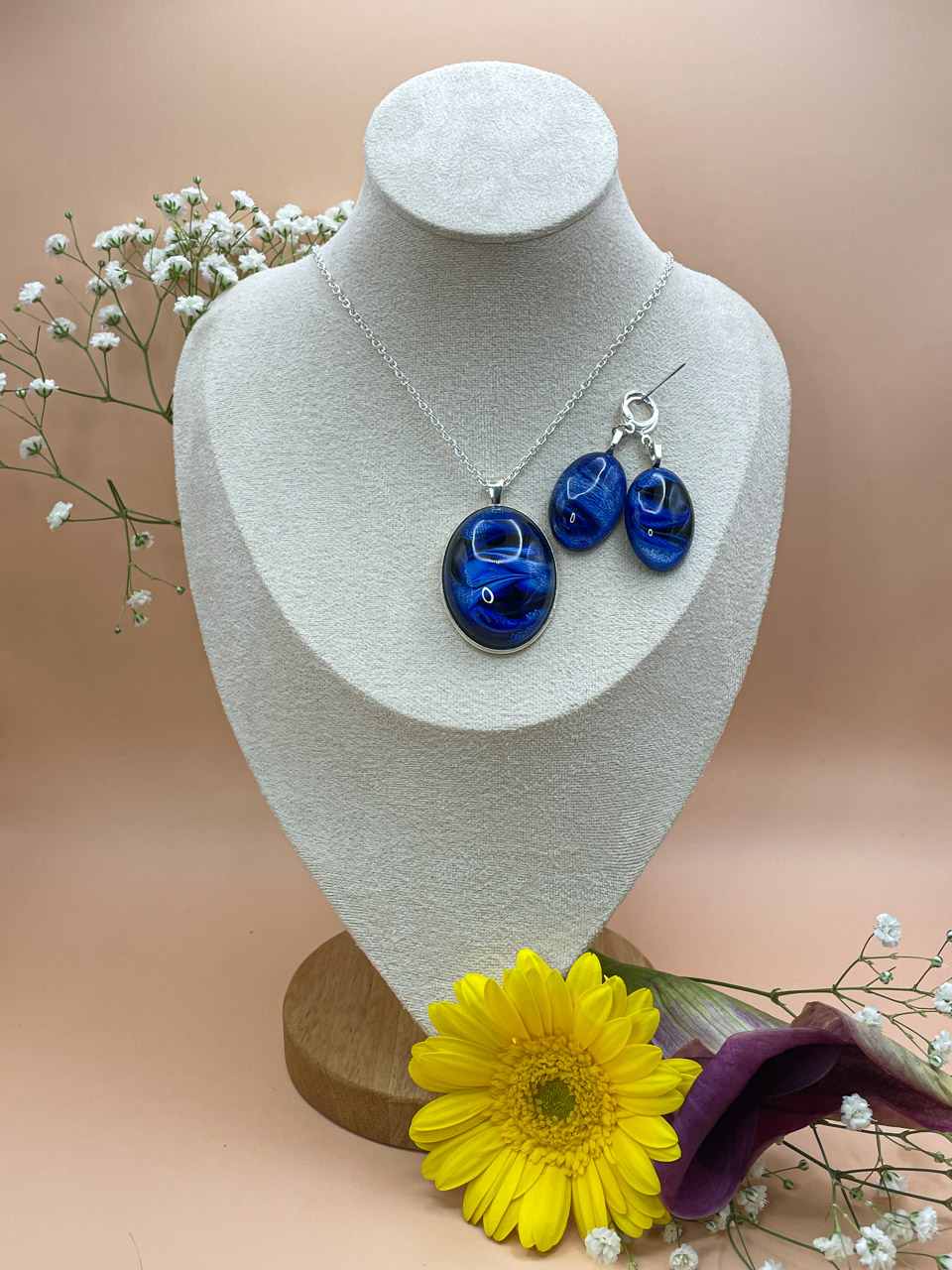 Délka řetízku: 51cm + 8cm prodlužovací řetízekVelikost přívěsku (včetně rámu): 5x3,2x1,3 cmVelikost náušnic (pouze kabošon): 3x2x1 cm