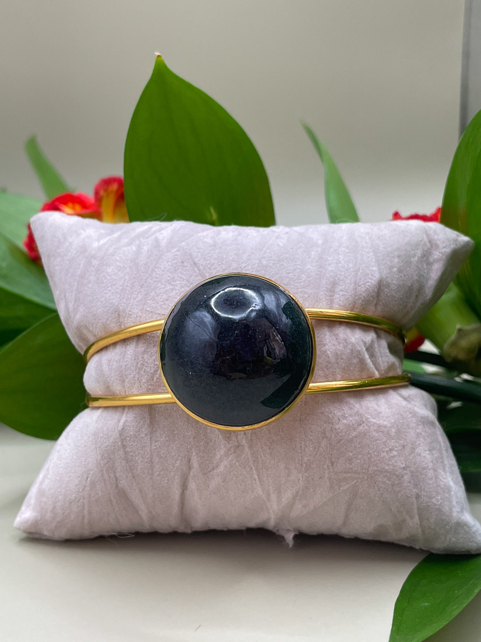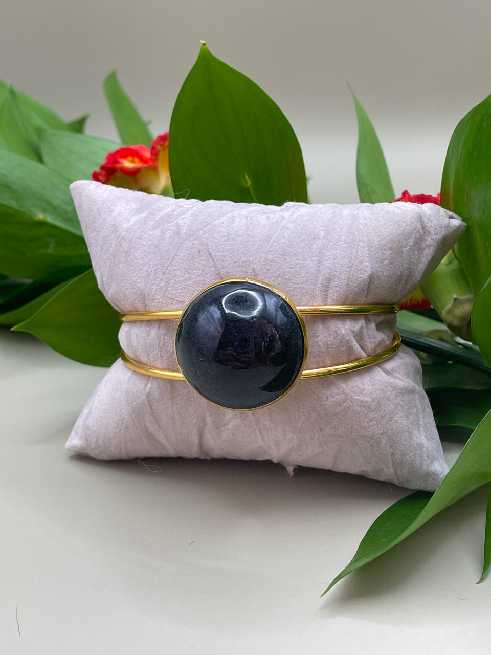 Náramek s pryskyřicí v černé barvě se třpytkami. Náramek je ve zlaté barvě a je nastavitelný.