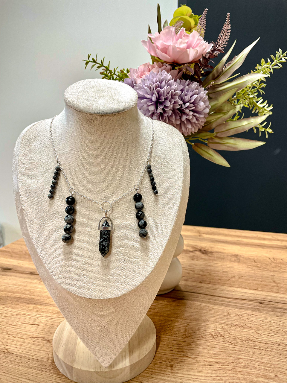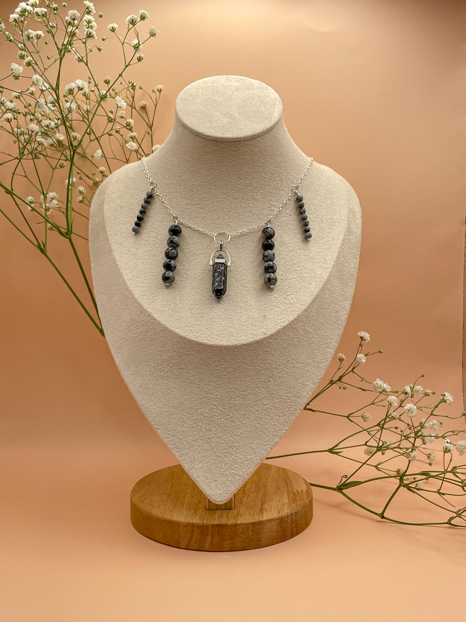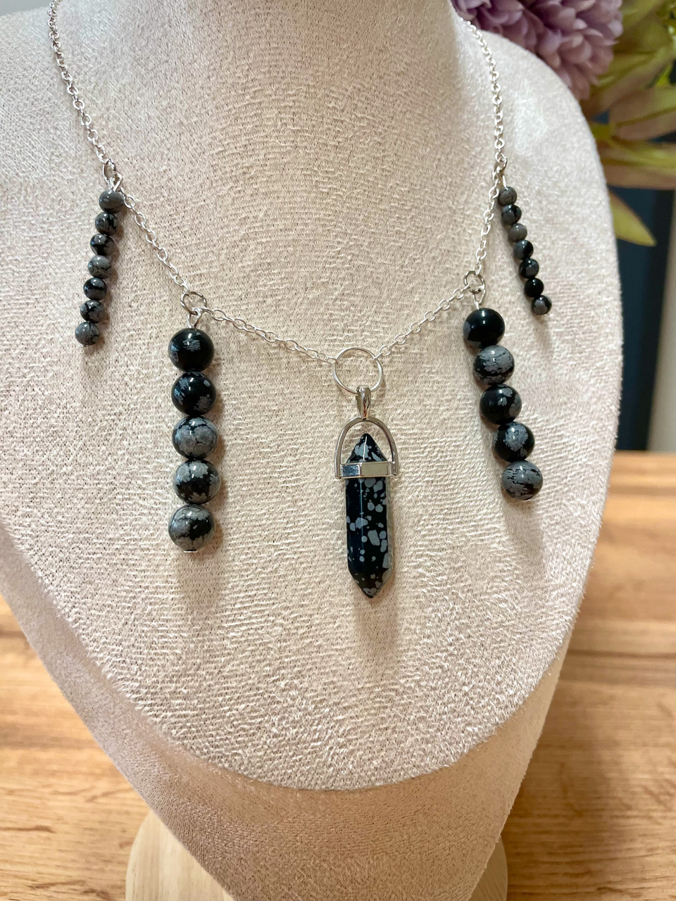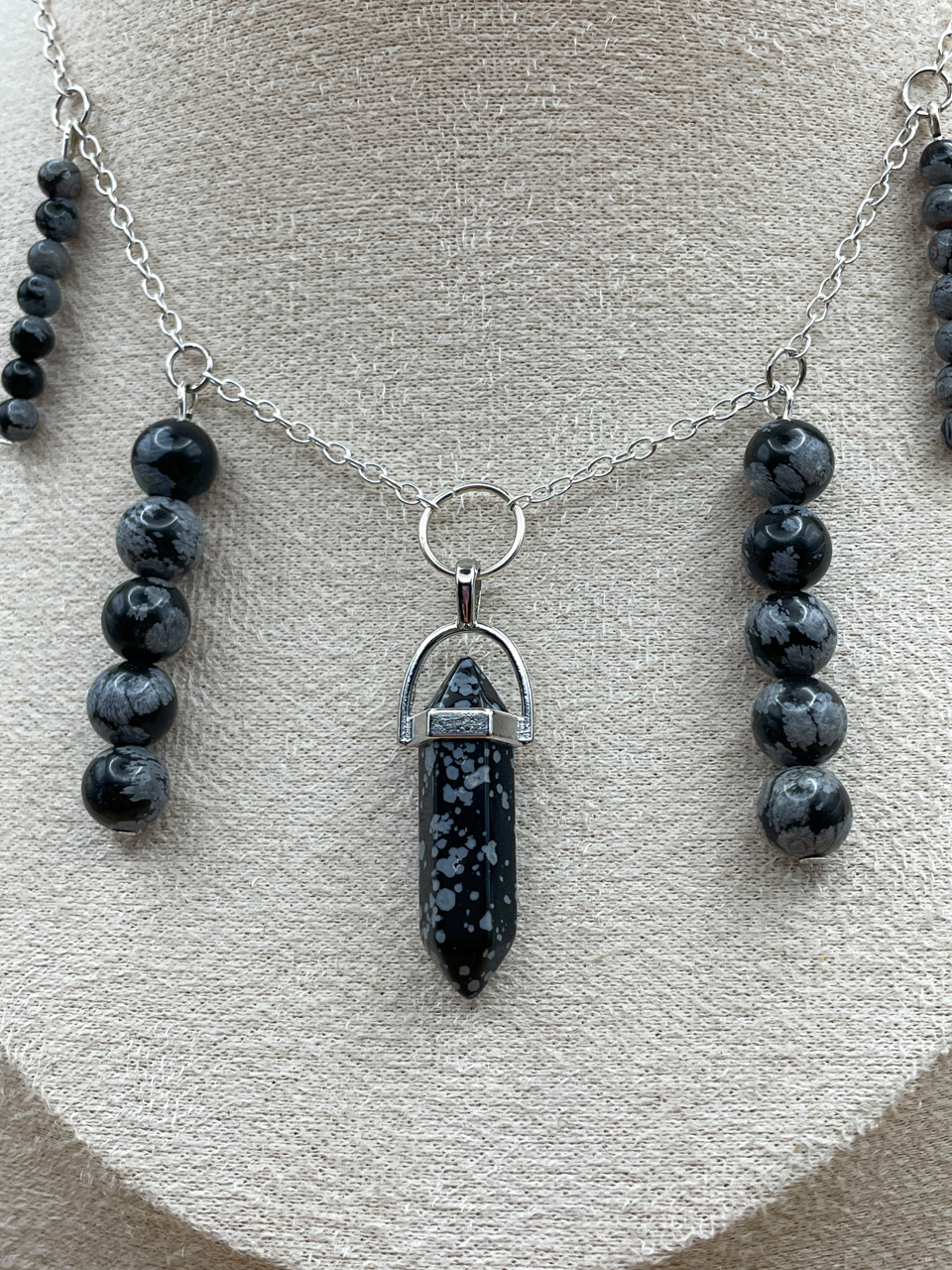 Náhrdelník ve stříbrné barvě s korálky z Obsidiánu vločkového. Délka řetízku 35cm (po přívěsek 44cm) + 7cm prodlužovací řetízek (není započítán v celkové délce).