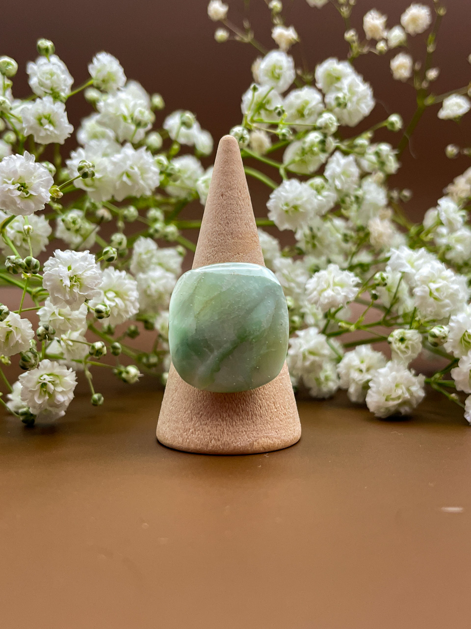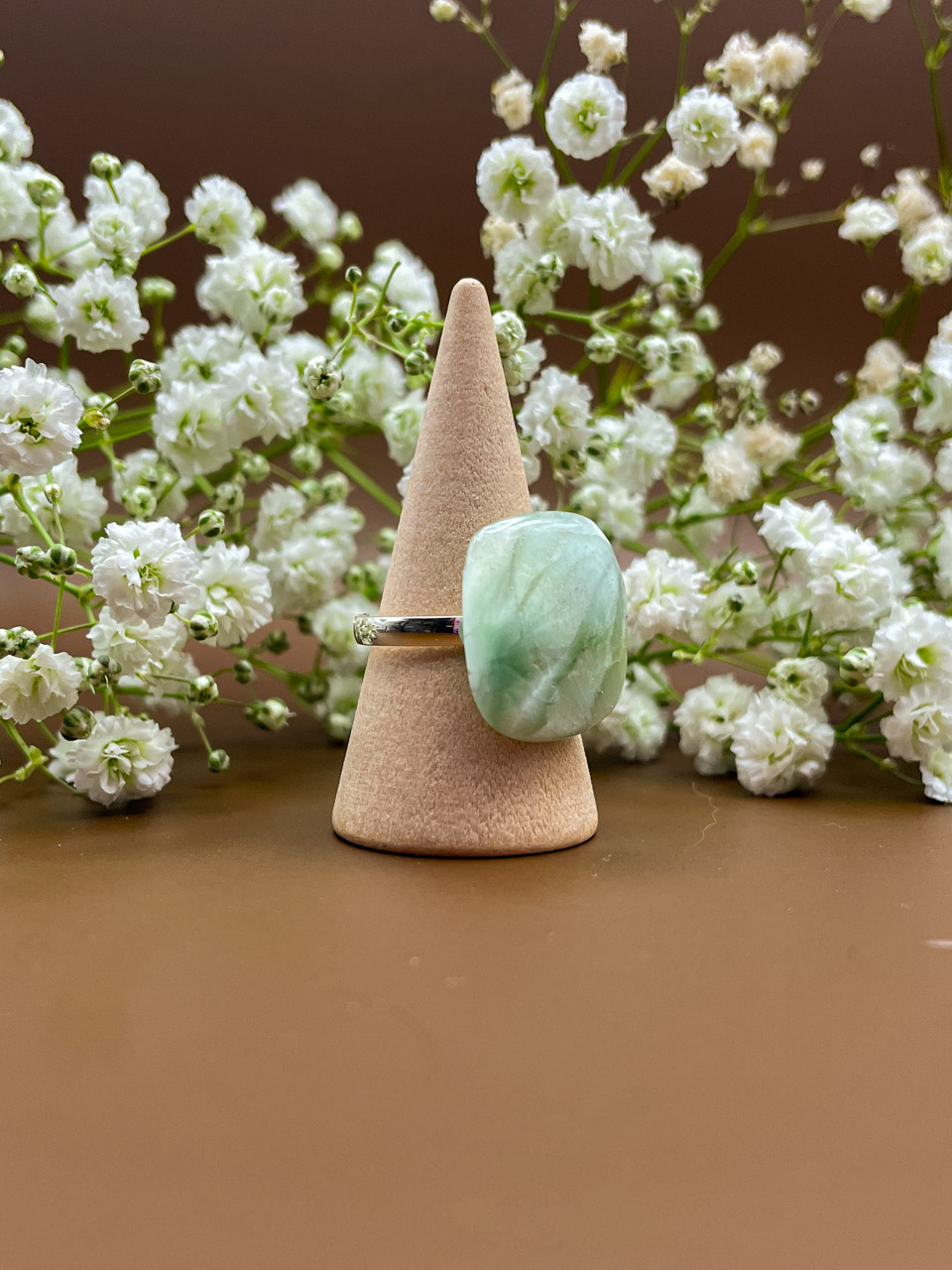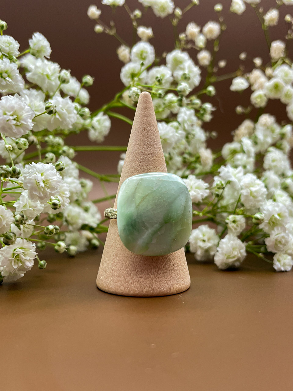 Nastavitelný prsten ve stříbrné barvě s Pektolitem, též známým jako zelený Larimar. Minerál je obalený v pryskyřici, aby neztrácel svou barvu.