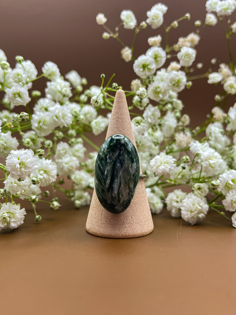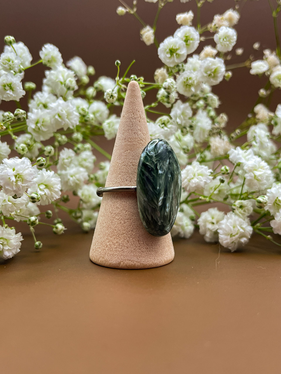 Nastavitelný prsten ve stříbrné barvě se Serafinitem. Minerál je obalený v pryskyřici, aby neztrácel svou barvu.