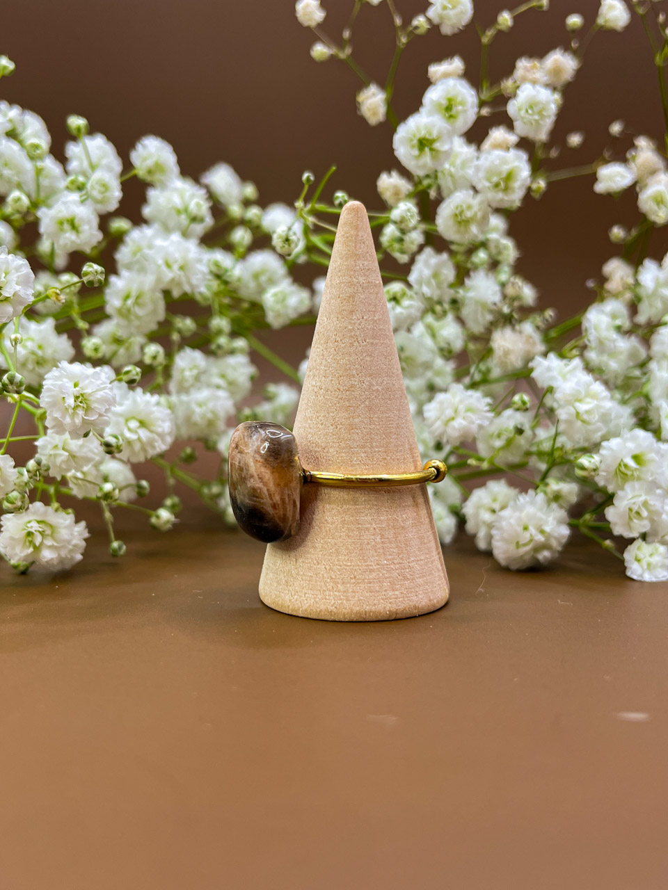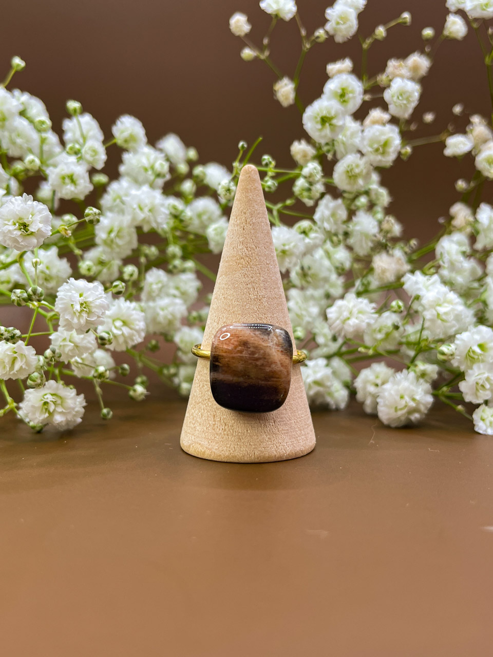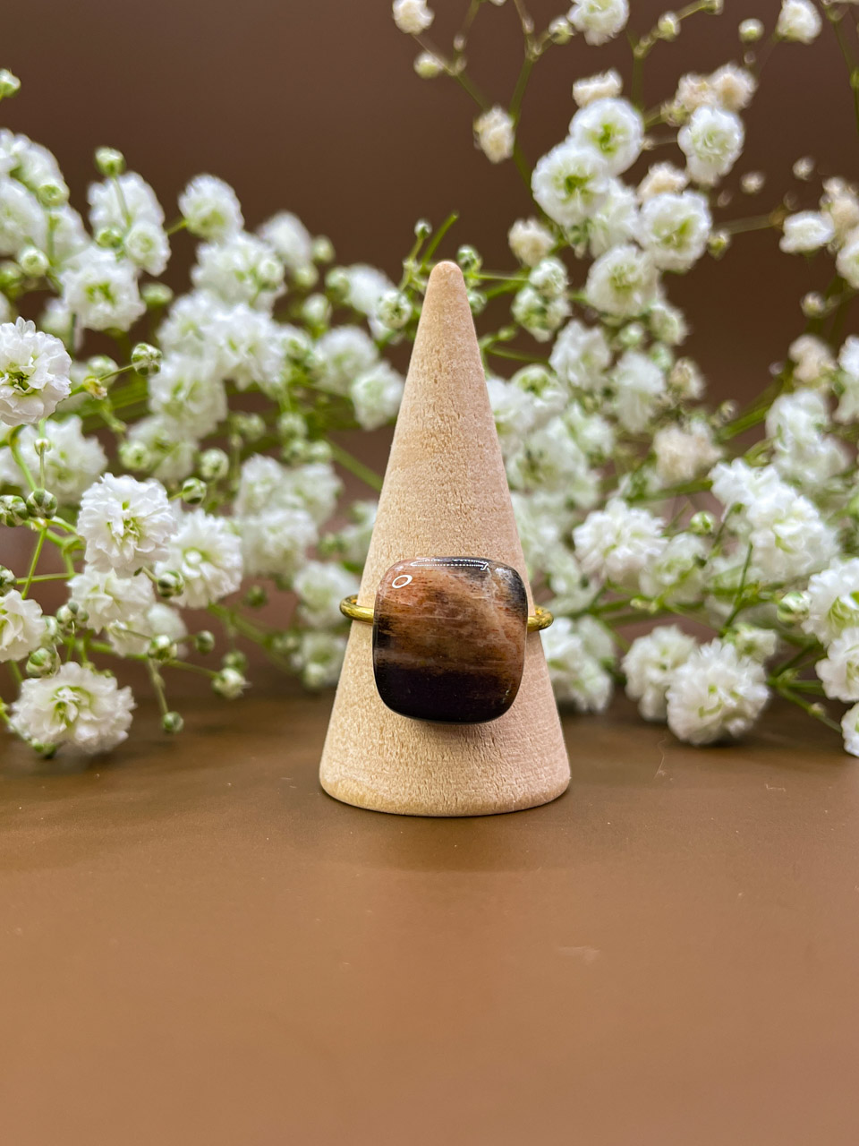 Nastavitelný prsten ve zlaté barvě se Slunečním kamenem. Minerál je obalený v pryskyřici, aby neztrácel svou barvu.