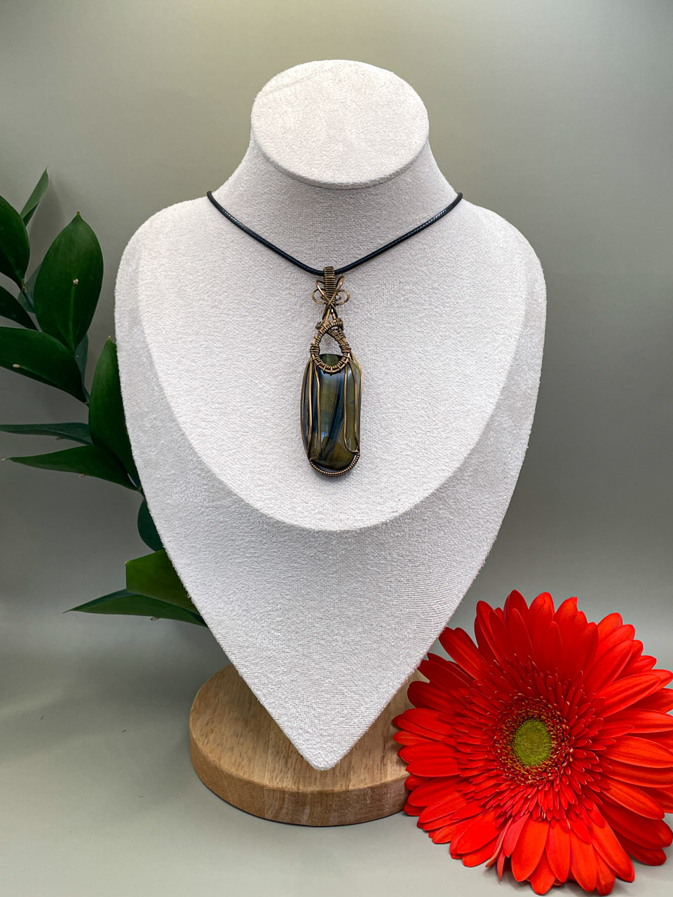 Velikost kamene, včetně drátku: 8,5x2,4x1,1 cm. Přívěsek bude na voskované černé šňůrce.