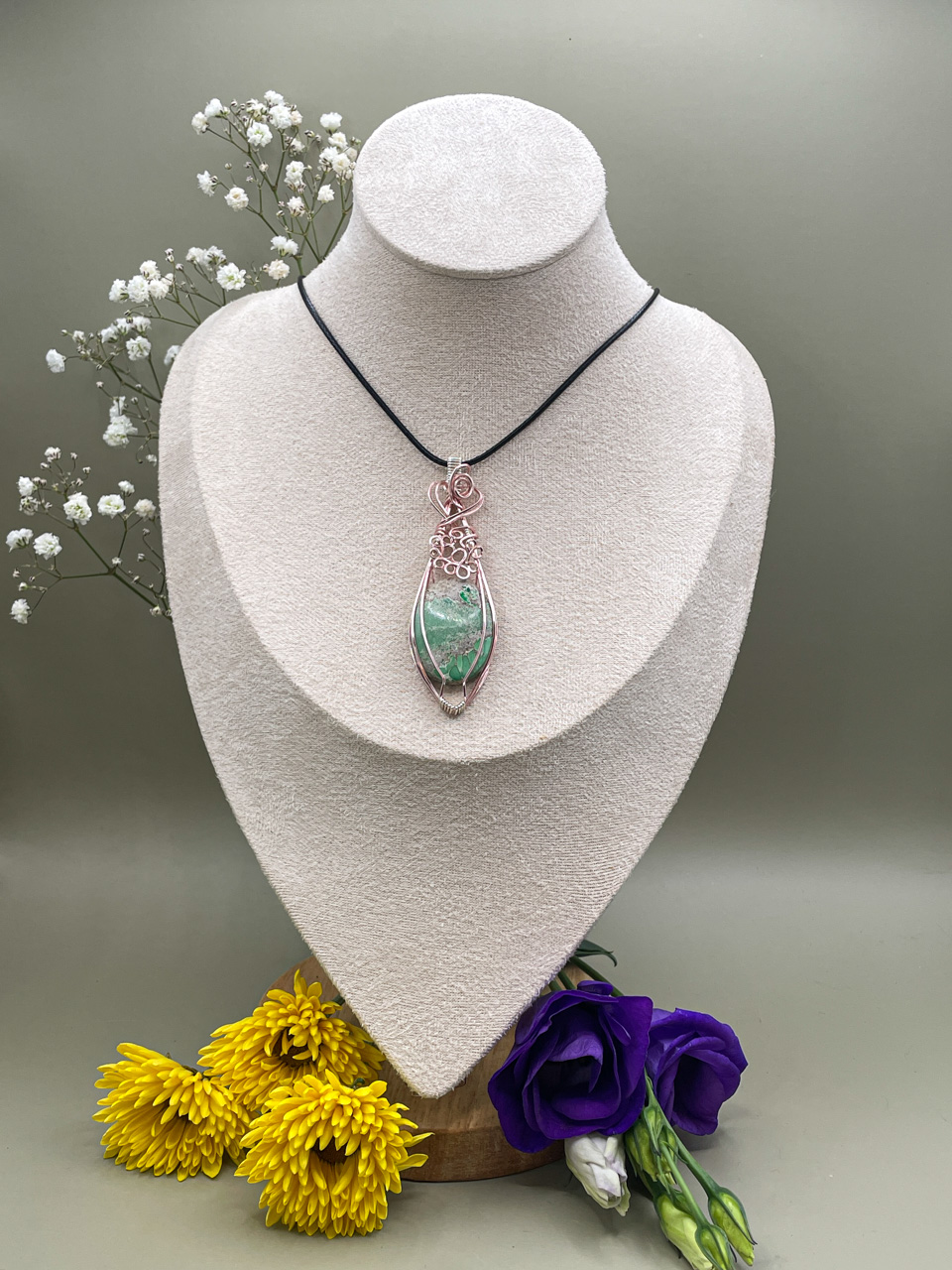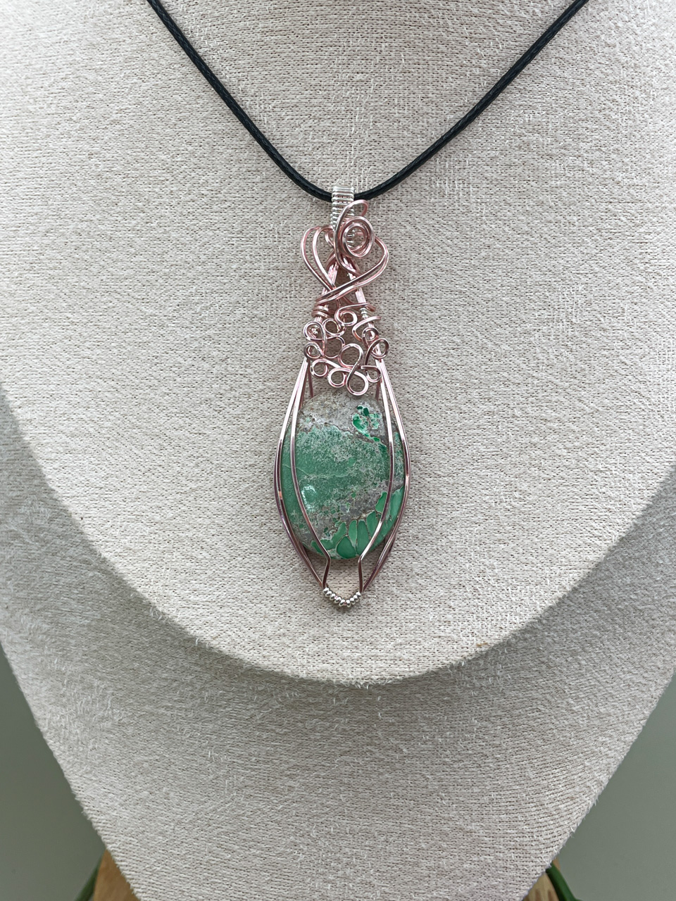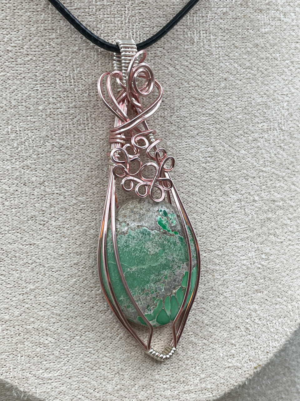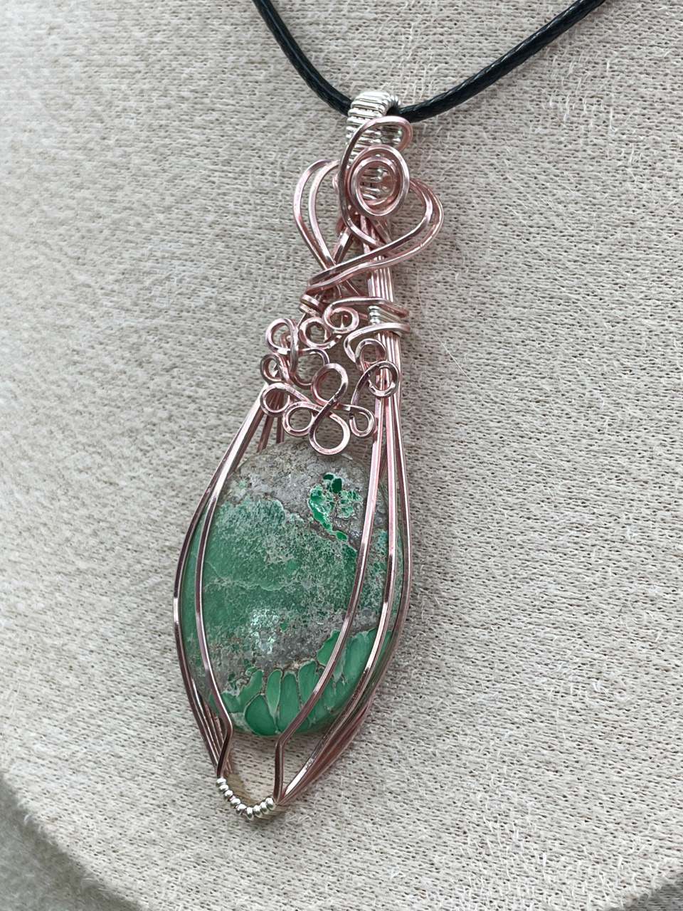Velikost kamene včetně drátku: 2,4x7,3x0,7 cm. Přívěsek bude na voskované černé šňůrce.